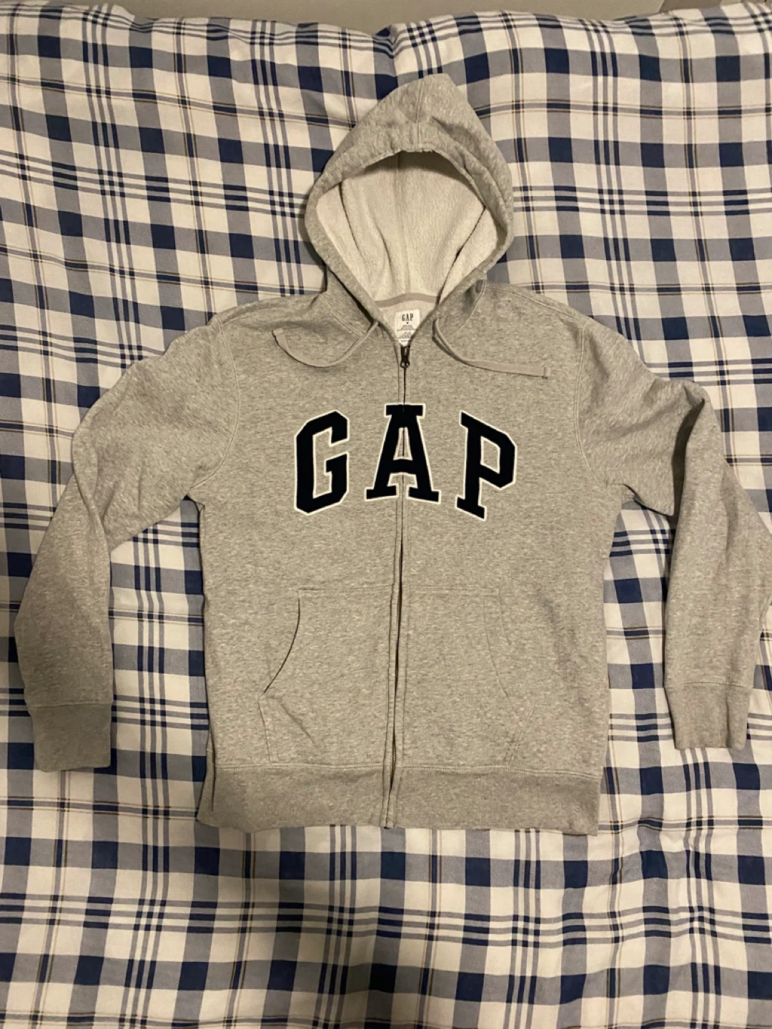 This is a grey zip-up hoodie from GAP. It features a classic GAP logo across the chest. Made with a comfortable blend, it's perfect for casual wear.