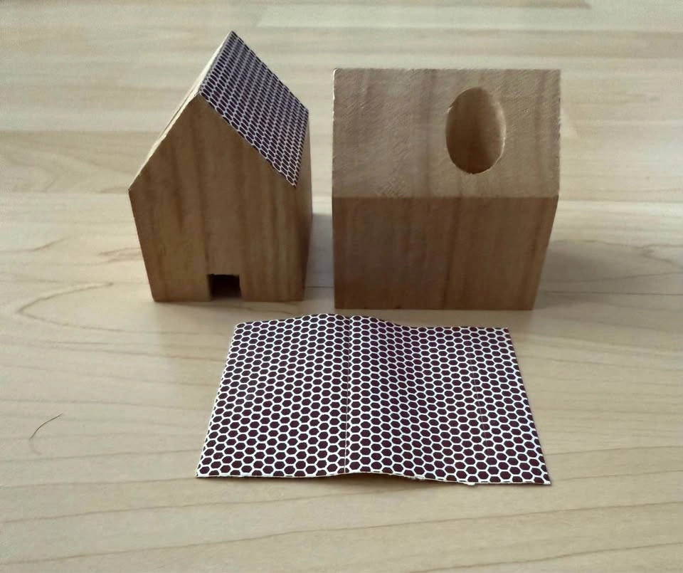 Adorable wooden matchboxes holder with a modern geometric design! Solid light wood with black & white patterned roof.