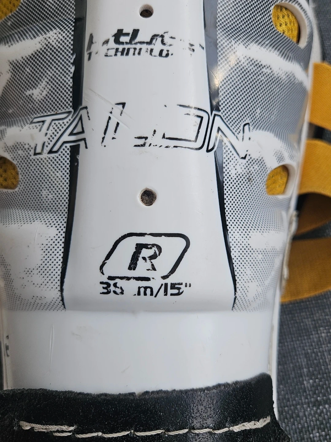 Reebok Talon hockey shin guards in white and black. Size 38.1cm/15". They're designed for protection on the ice.