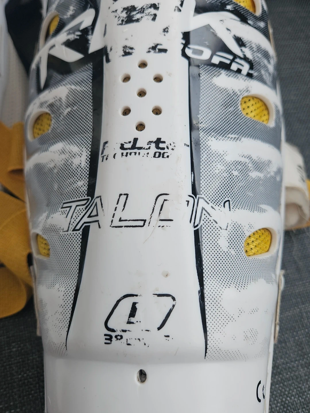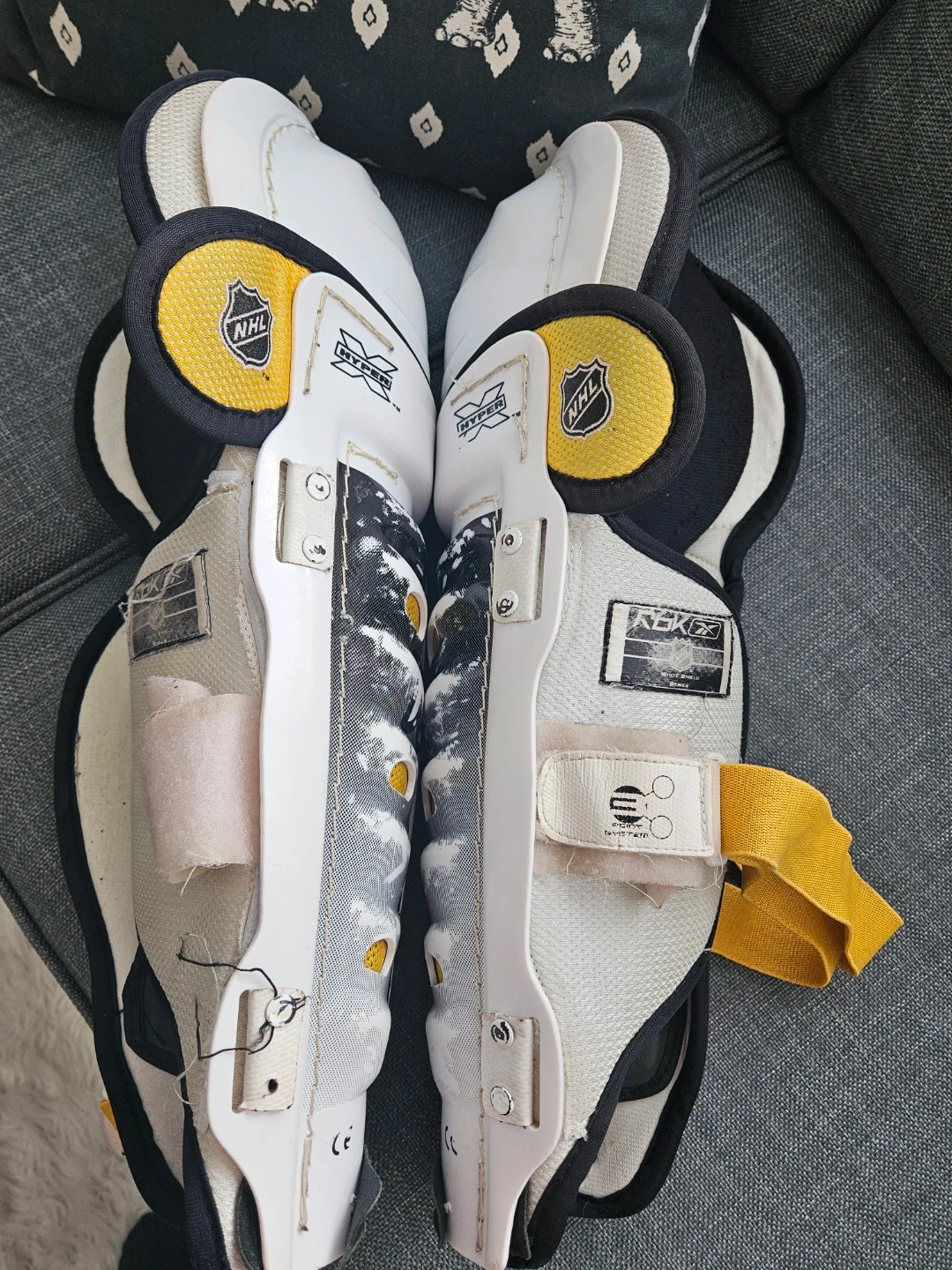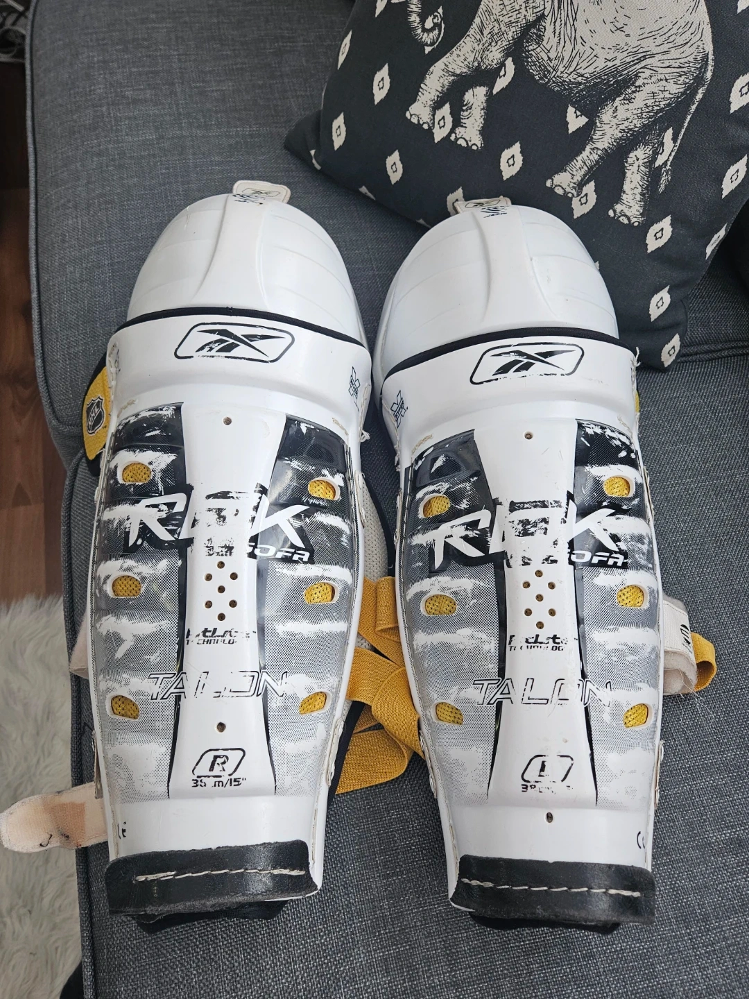 Reebok Talon hockey shin guards in white and black. Size 38.1cm/15". They're designed for protection on the ice.