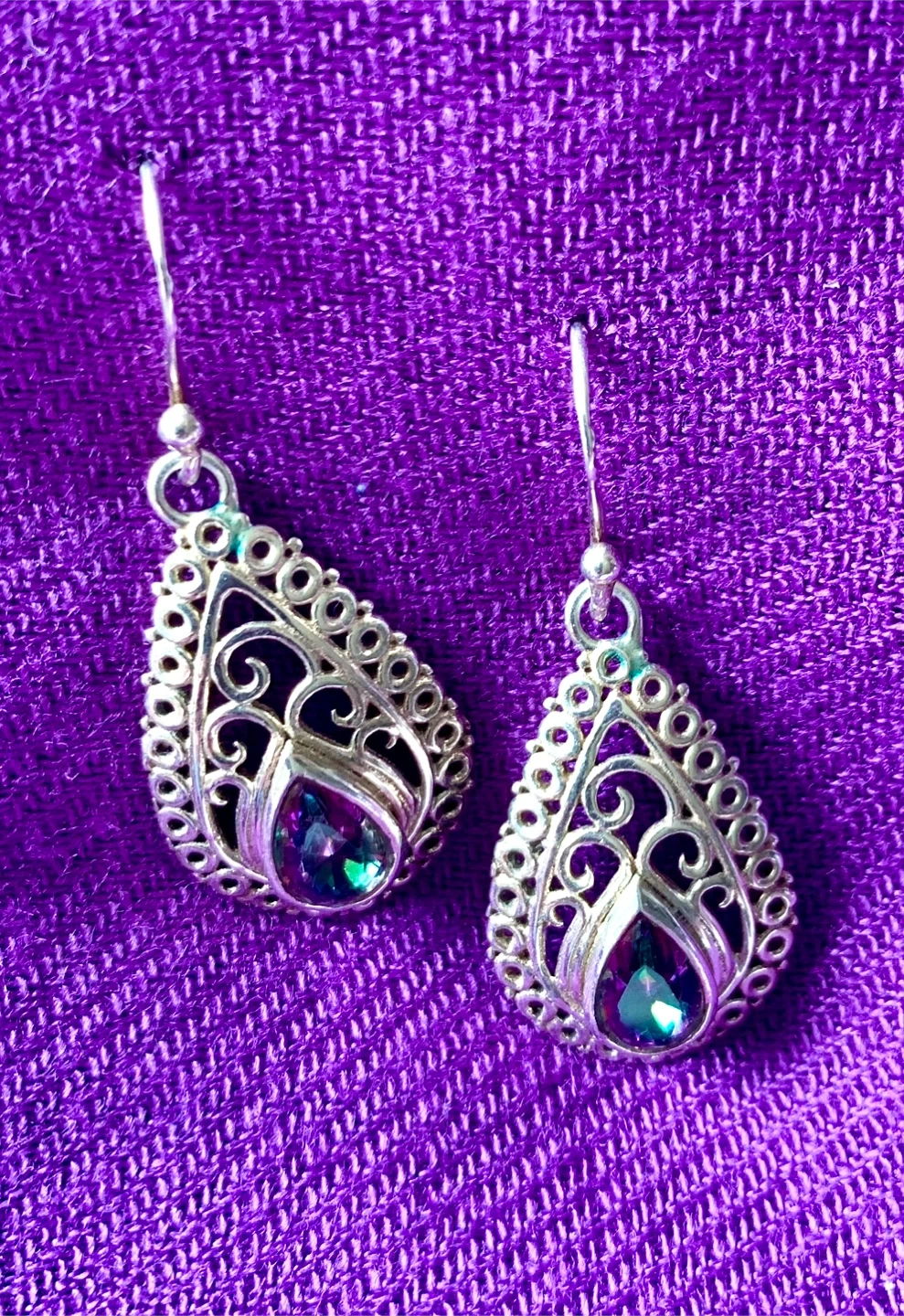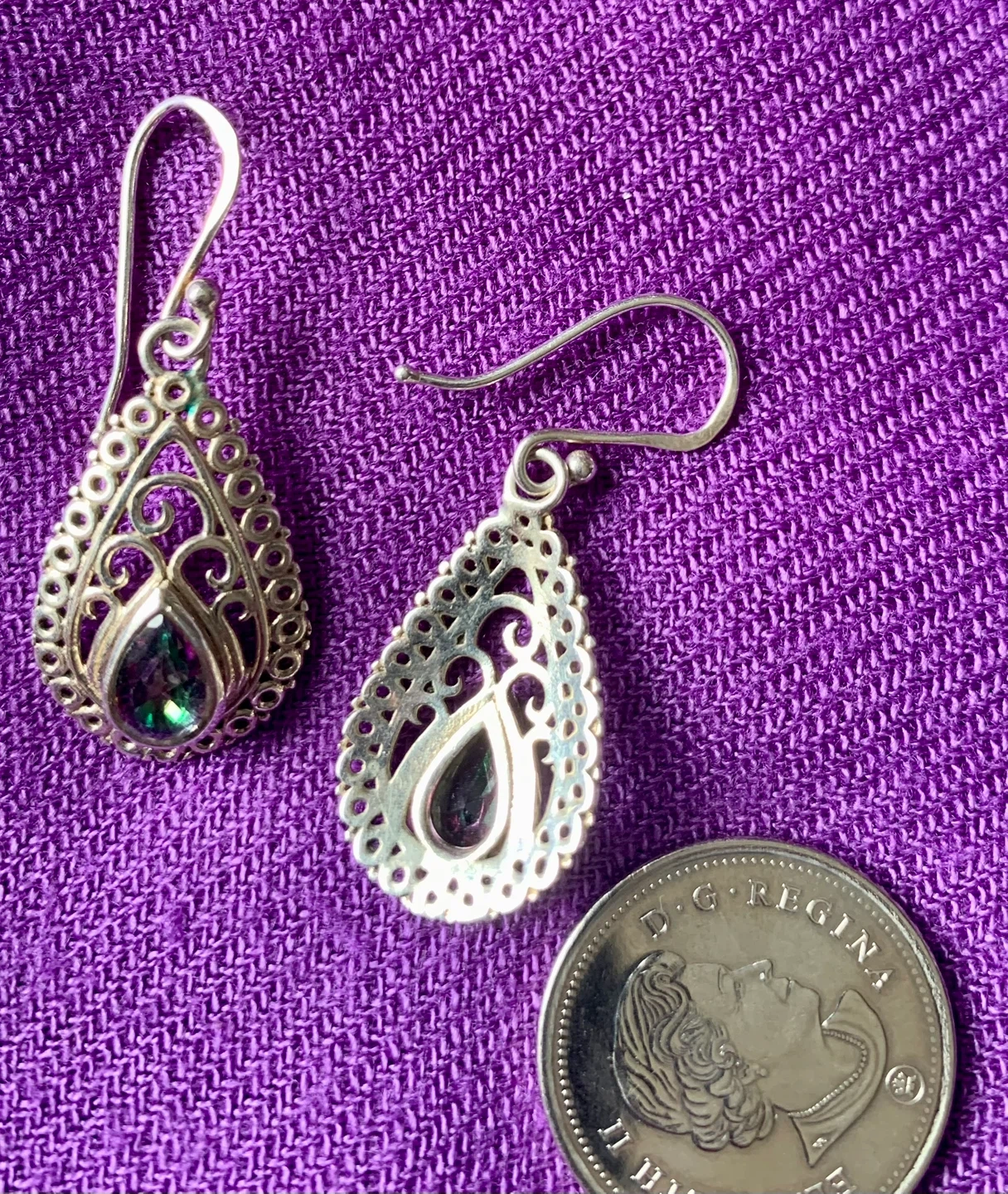 These elegant silver teardrop earrings feature a filigree design and a captivating Amethyst gemstone. They're lightweight and have a classic hook closure. These would add a touch of colour to any outfit!