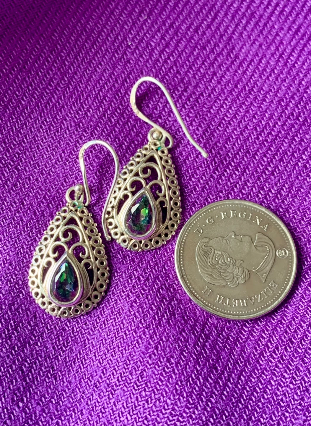 These elegant silver teardrop earrings feature a filigree design and a captivating Amethyst gemstone. They're lightweight and have a classic hook closure. These would add a touch of colour to any outfit!