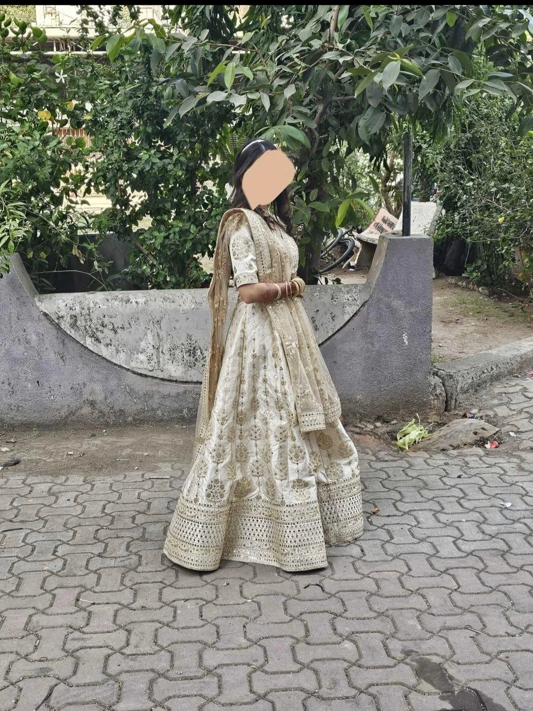 Beautiful ivory and gold embellished lehenga choli set. Features intricate embroidery and sequin work throughout the skirt and blouse. Matching dupatta included.