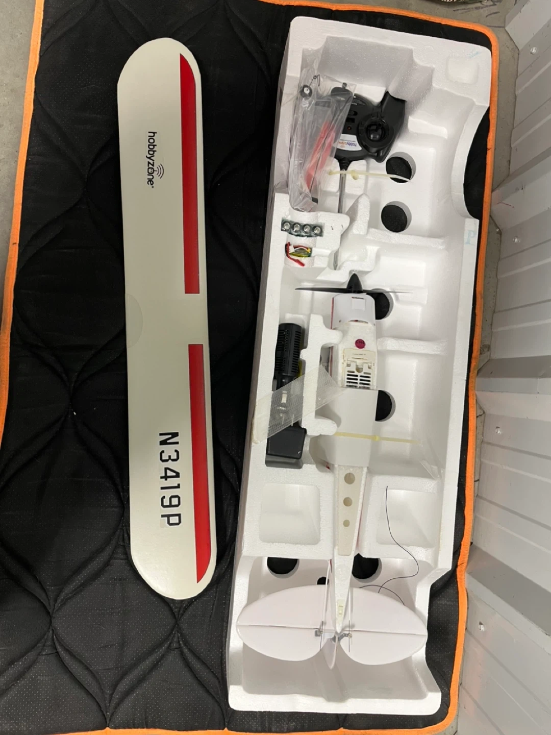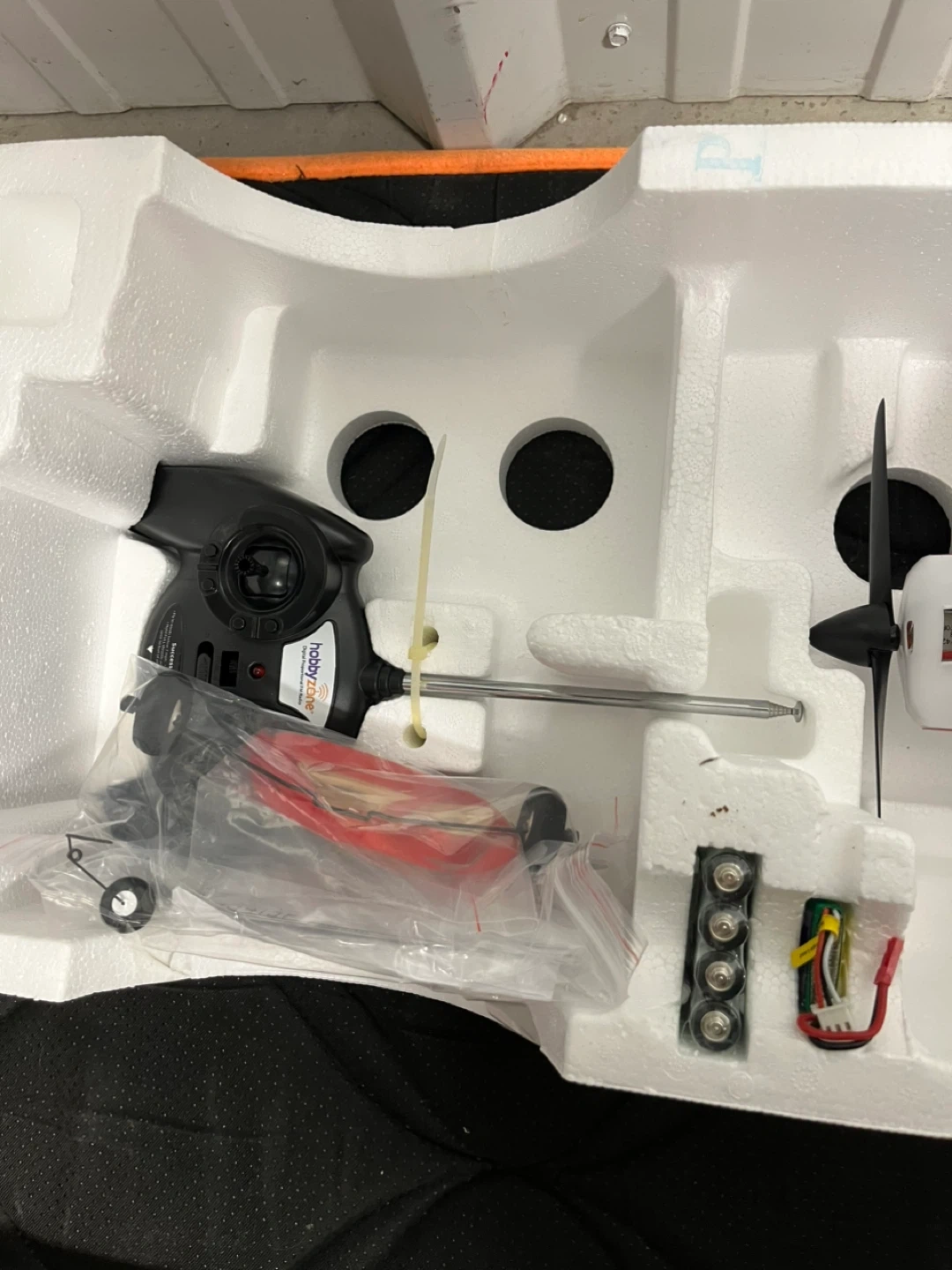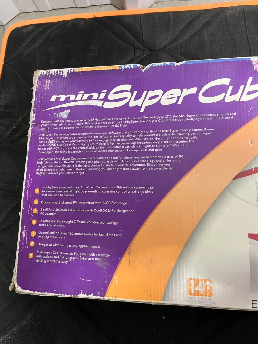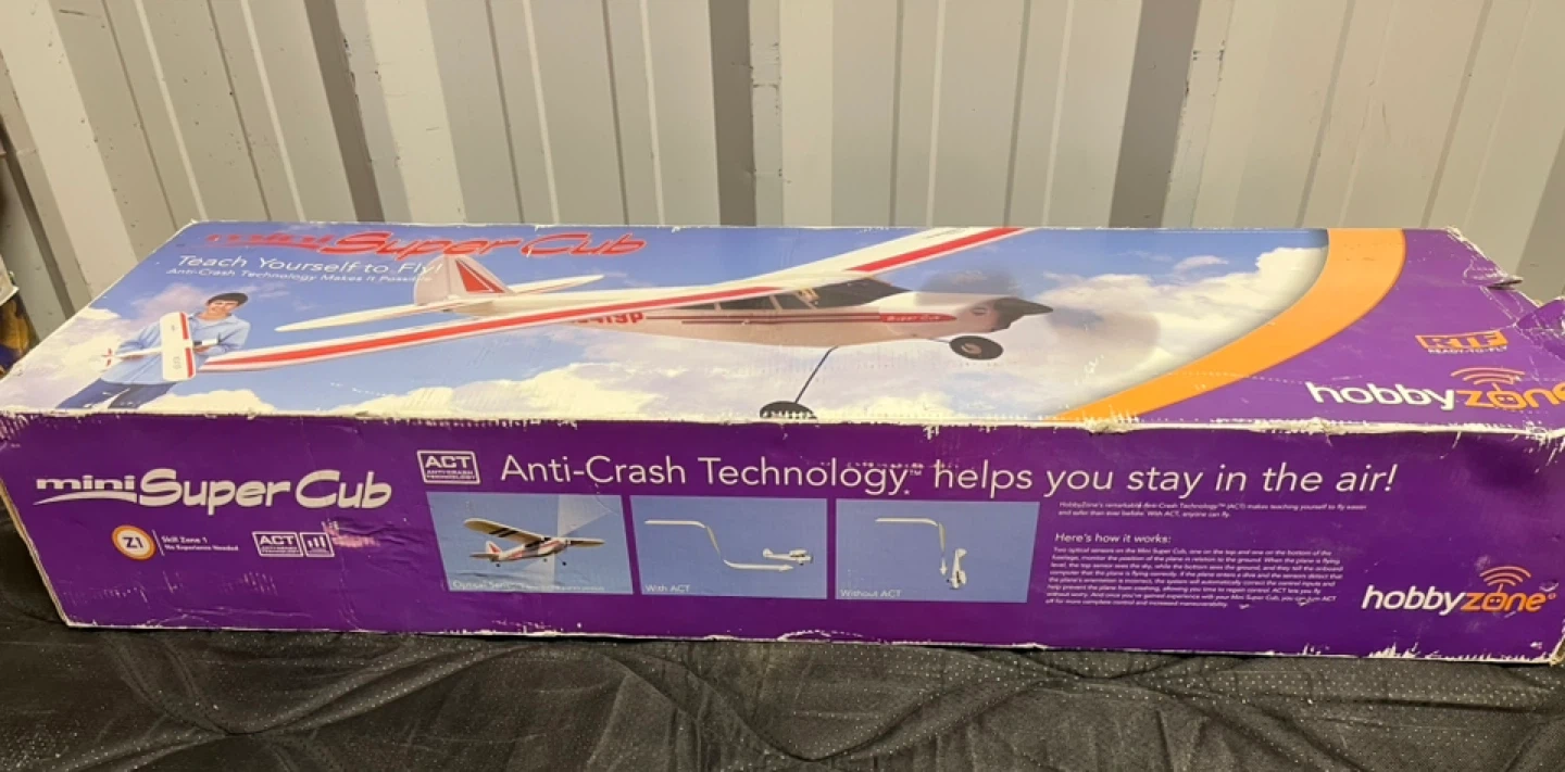 HobbyZone Mini Super Cub Ready-To-Fly RC airplane featuring Anti-Crash Technology to help beginners stay in the air. Includes 2-cell 7.4V 300mAh Li-Po battery with AC & DC chargers, plus a 3-channel 3-channel FM transmitter with a 1,300-ft range. Built with durable and lightweight Z-Foam