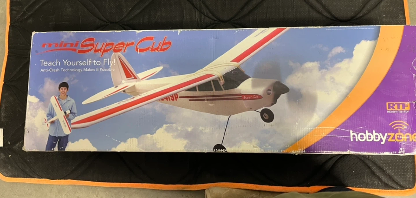 HobbyZone Mini Super Cub Ready-To-Fly RC airplane featuring Anti-Crash Technology to help beginners stay in the air. Includes 2-cell 7.4V 300mAh Li-Po battery with AC & DC chargers, plus a 3-channel 3-channel FM transmitter with a 1,300-ft range. Built with durable and lightweight Z-Foam