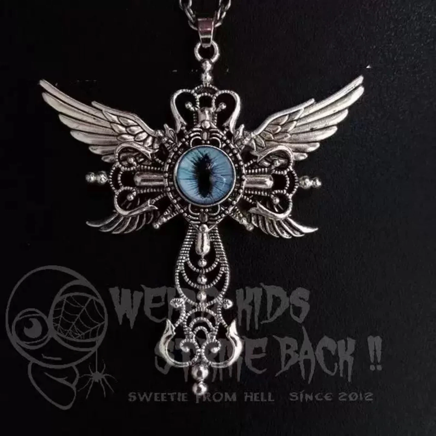 A unique pendant necklace featuring a winged cross design with a striking blue eye in the centre. The intricate metalwork gives it a distinctive gothic or steampunk aesthetic. It's made of metal with a silver-tone finish.