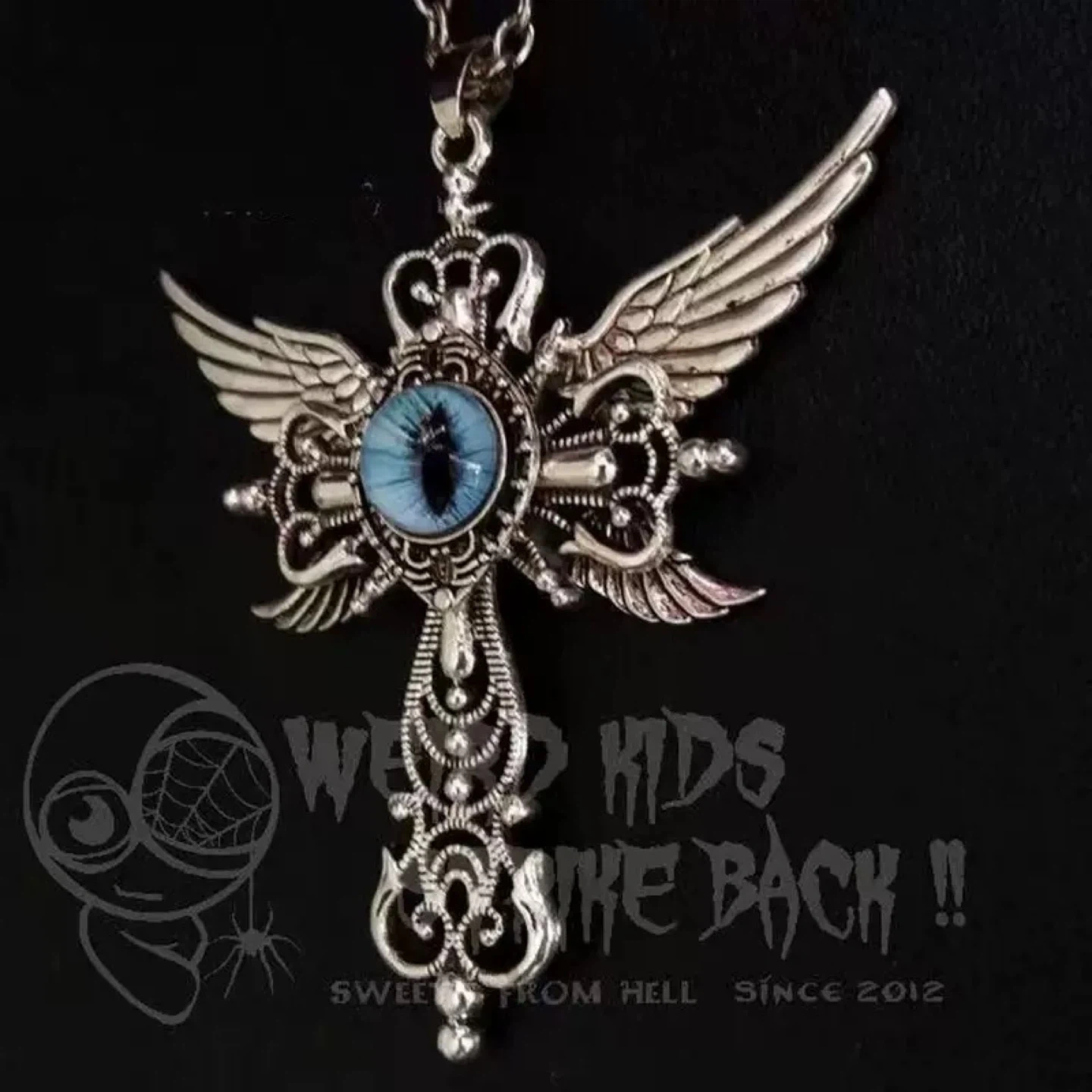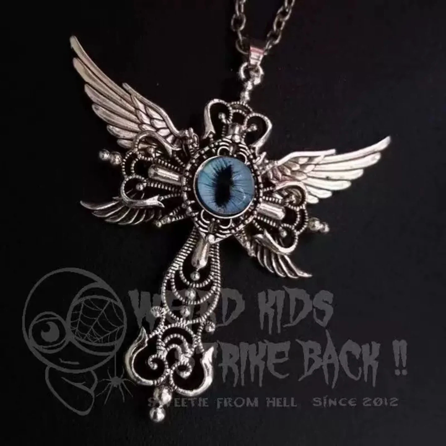 A unique pendant necklace featuring a winged cross design with a striking blue eye in the centre. The intricate metalwork gives it a distinctive gothic or steampunk aesthetic. It's made of metal with a silver-tone finish.