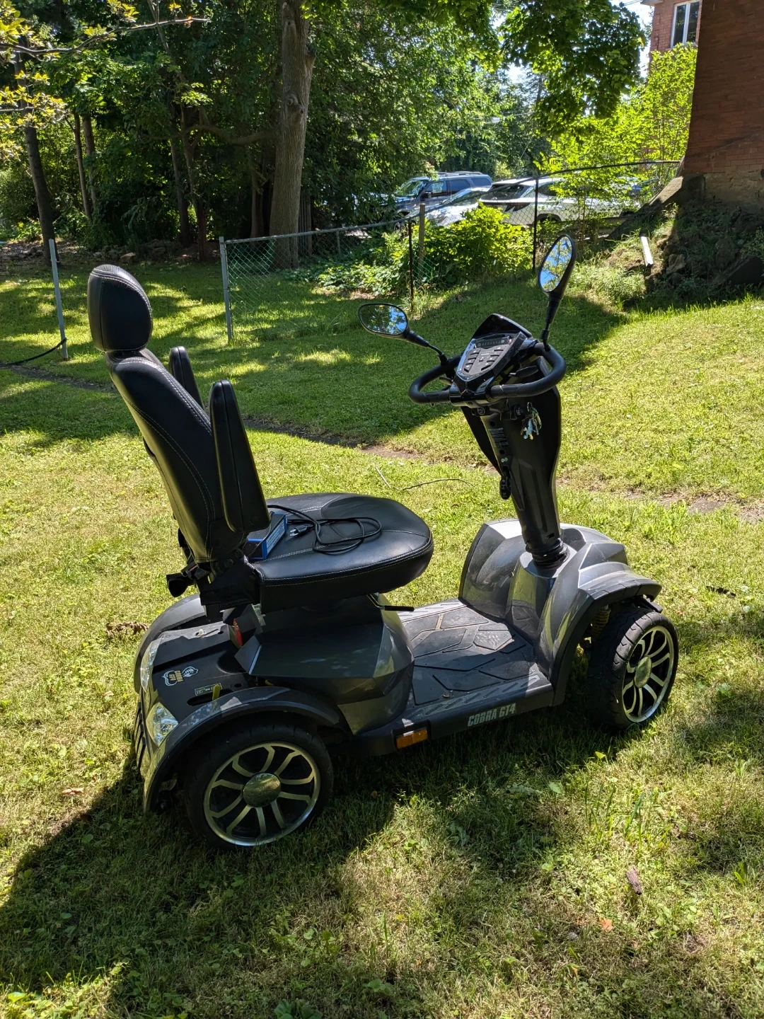 A used Drive Cobra GT4 mobility scooter in grey. It features a comfortable captain's seat and ample legroom. This scooter is great for navigating both indoor and outdoor spaces with ease. New batteries!
