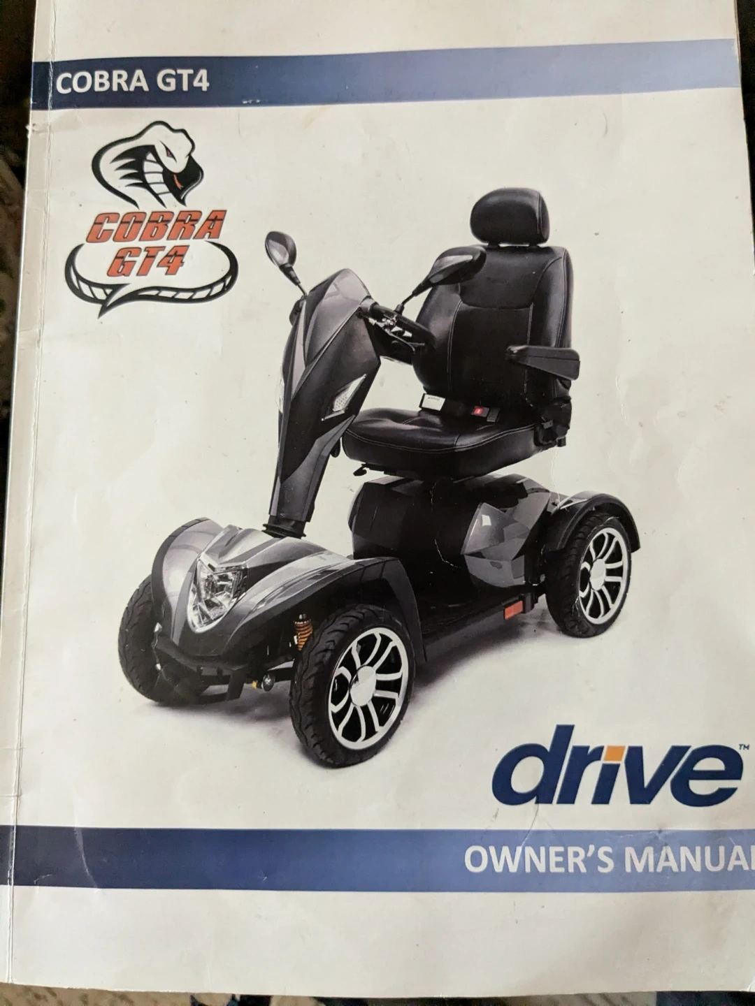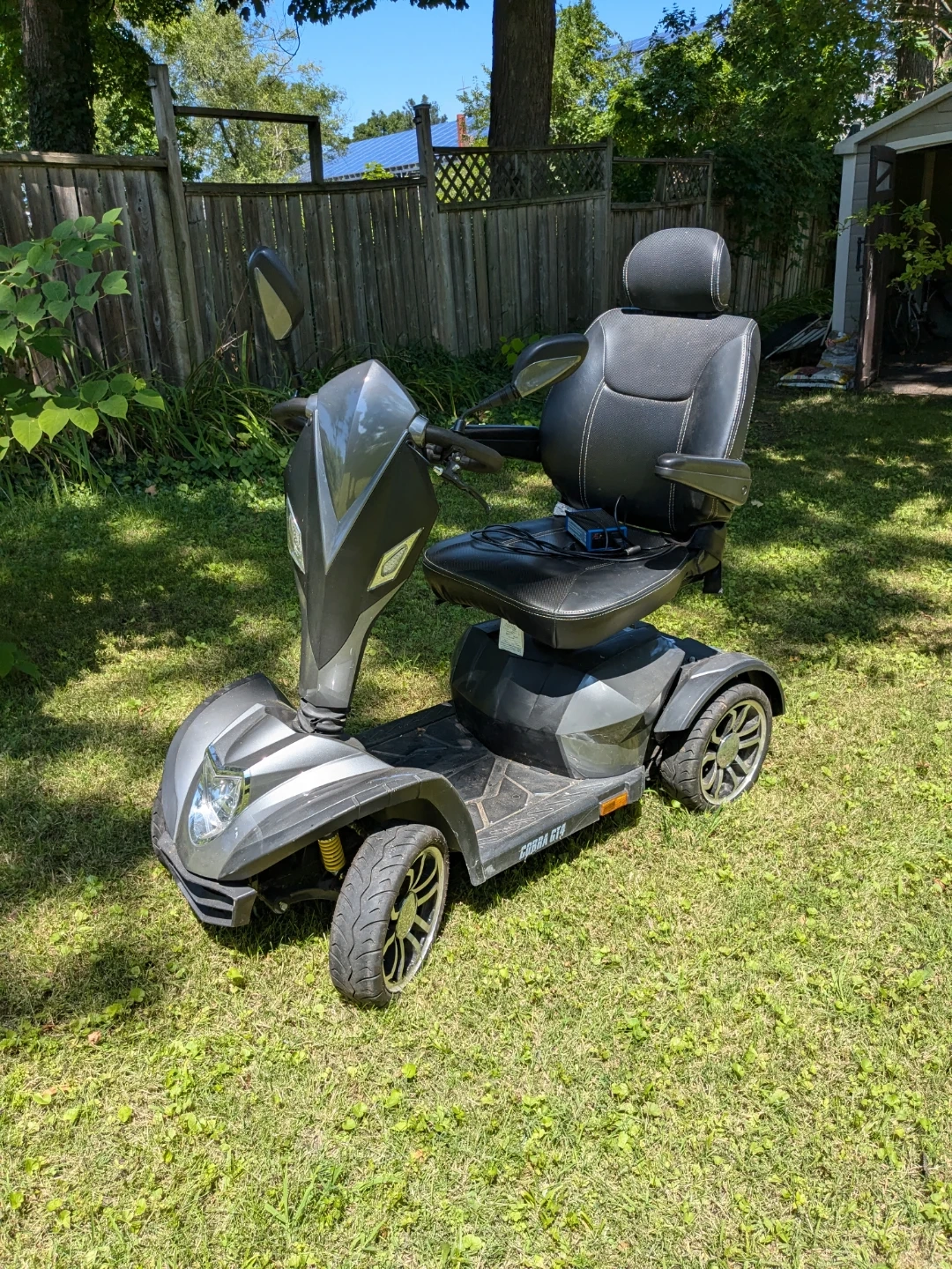 A used Drive Cobra GT4 mobility scooter in grey. It features a comfortable captain's seat and ample legroom. This scooter is great for navigating both indoor and outdoor spaces with ease. New batteries!