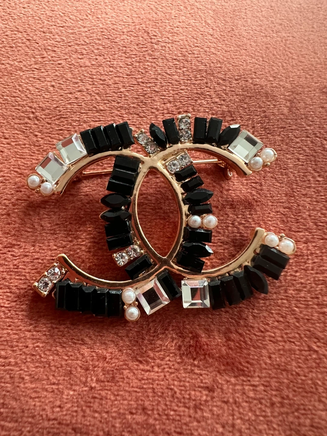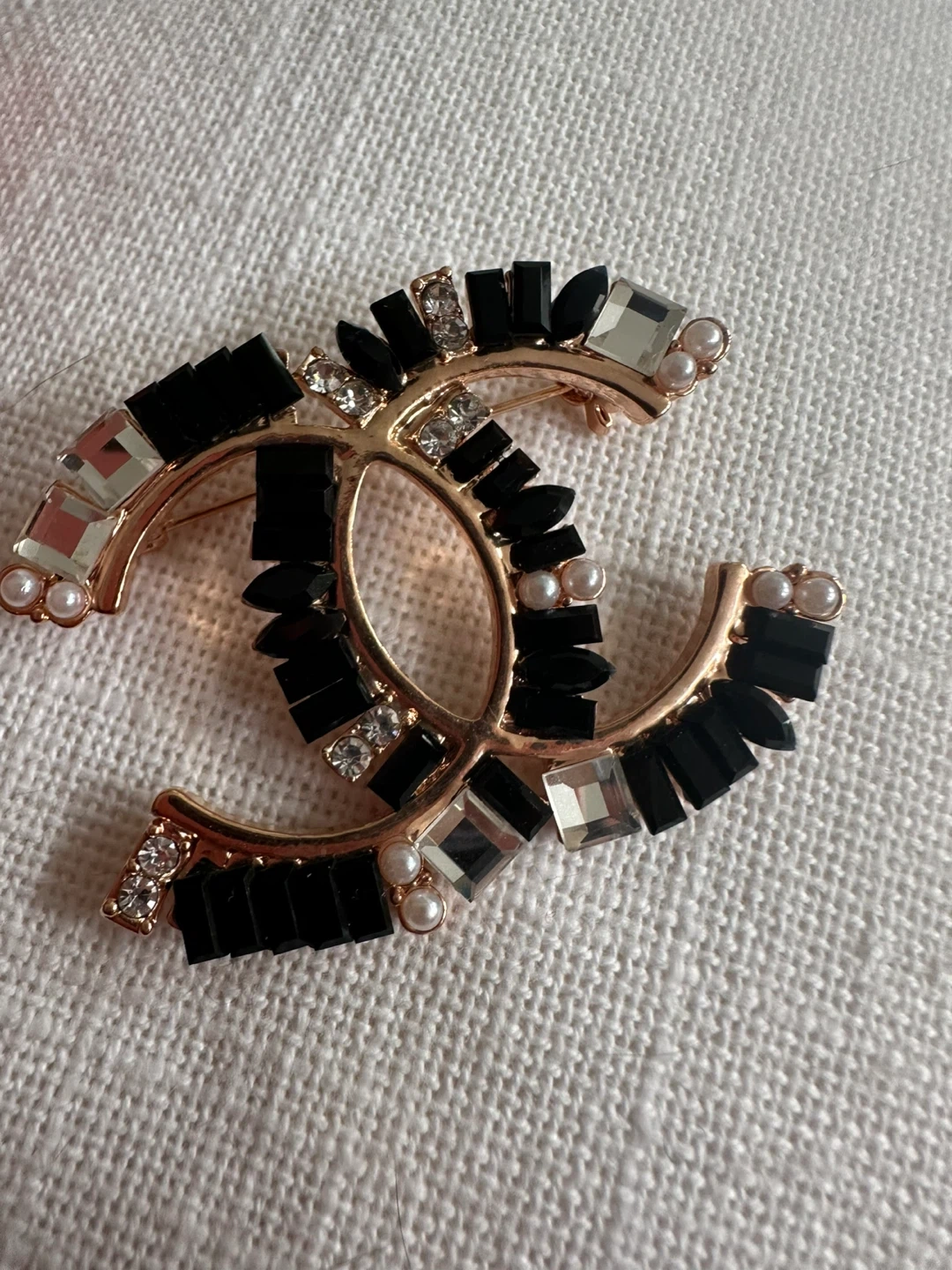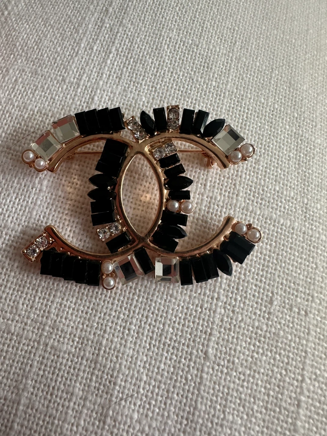 Stylish CC logo brooch embellished with black, clear, and pearl accents. It's a statement piece for any outfit. Brooch measures approximately 2 inches across.