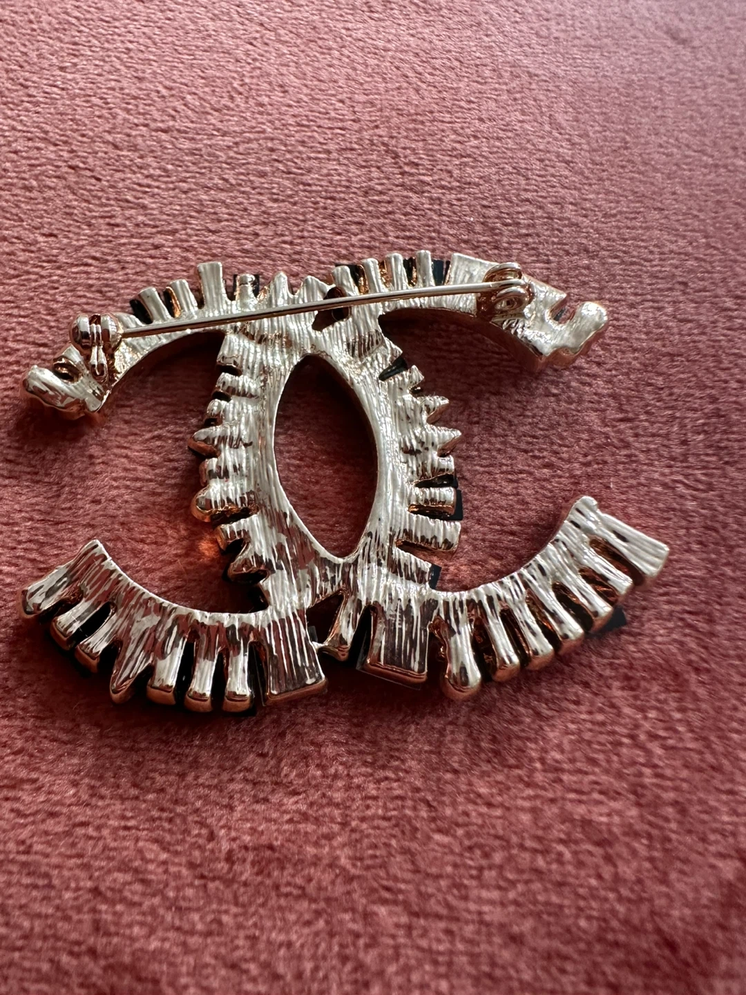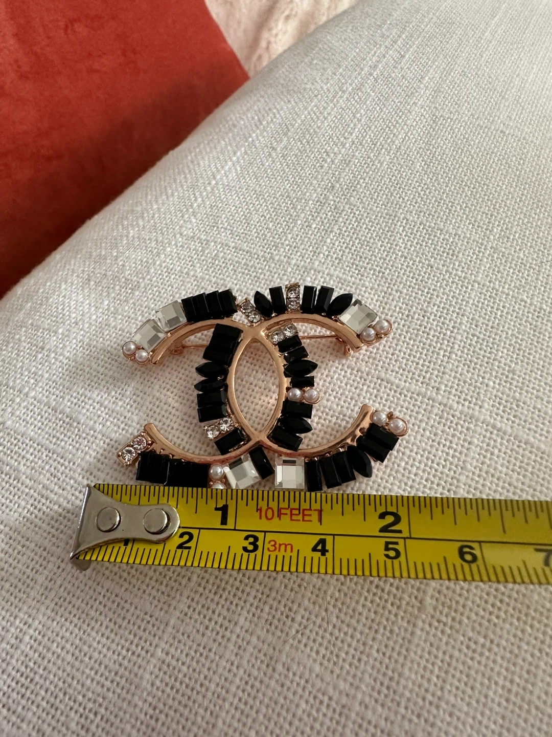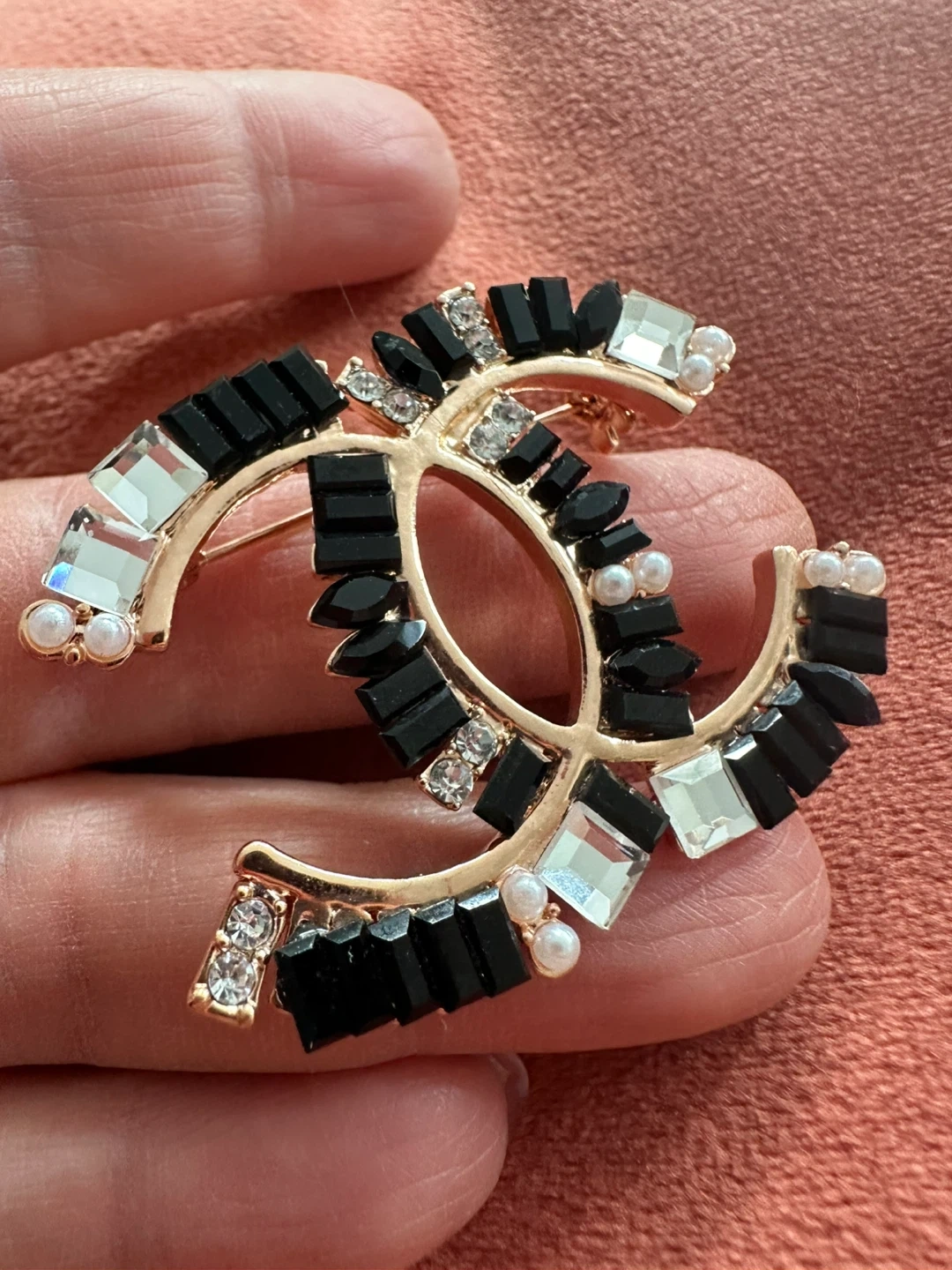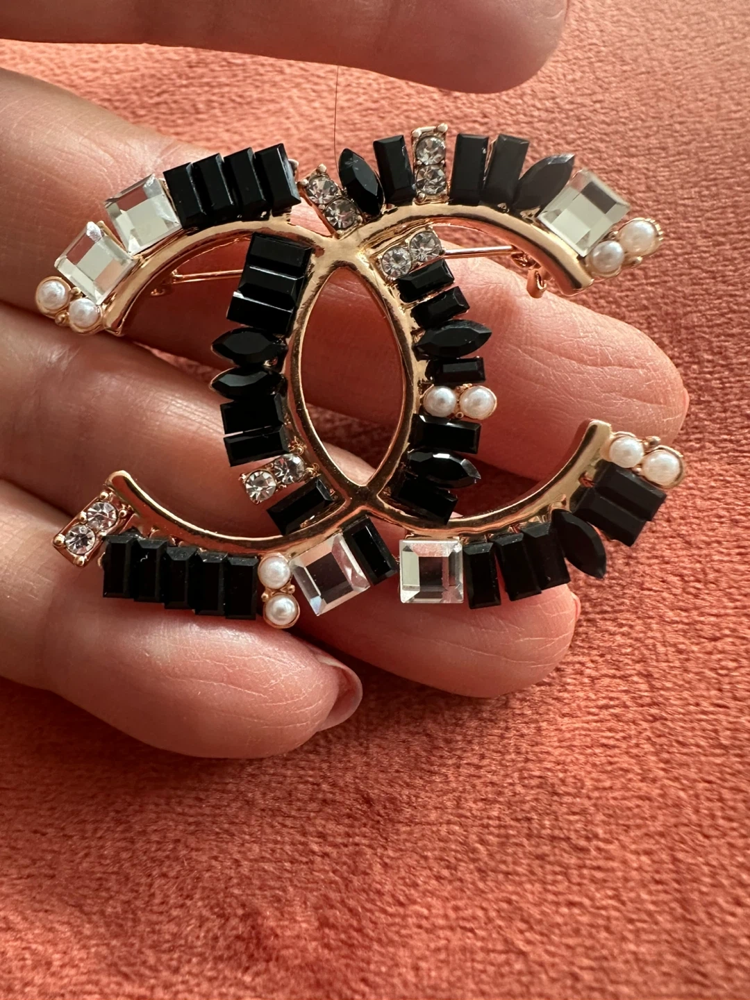 Stylish CC logo brooch embellished with black, clear, and pearl accents. It's a statement piece for any outfit. Brooch measures approximately 2 inches across.