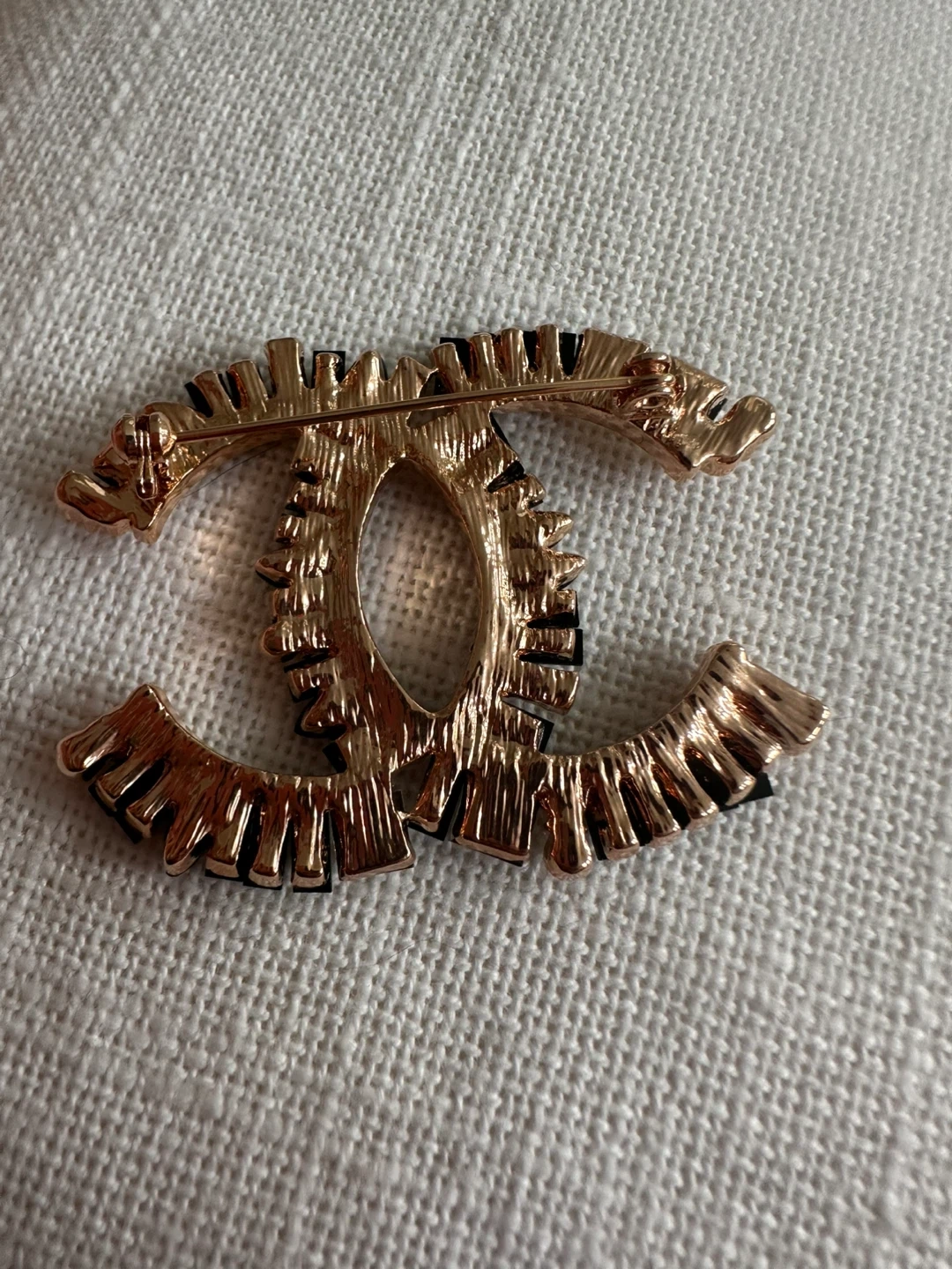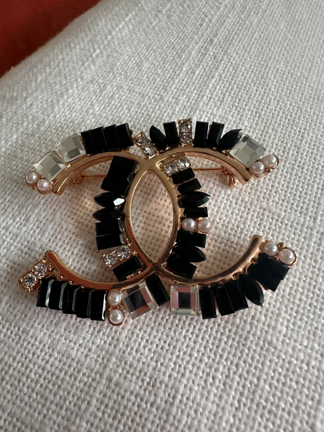 Stylish CC logo brooch embellished with black, clear, and pearl accents. It's a statement piece for any outfit. Brooch measures approximately 2 inches across.