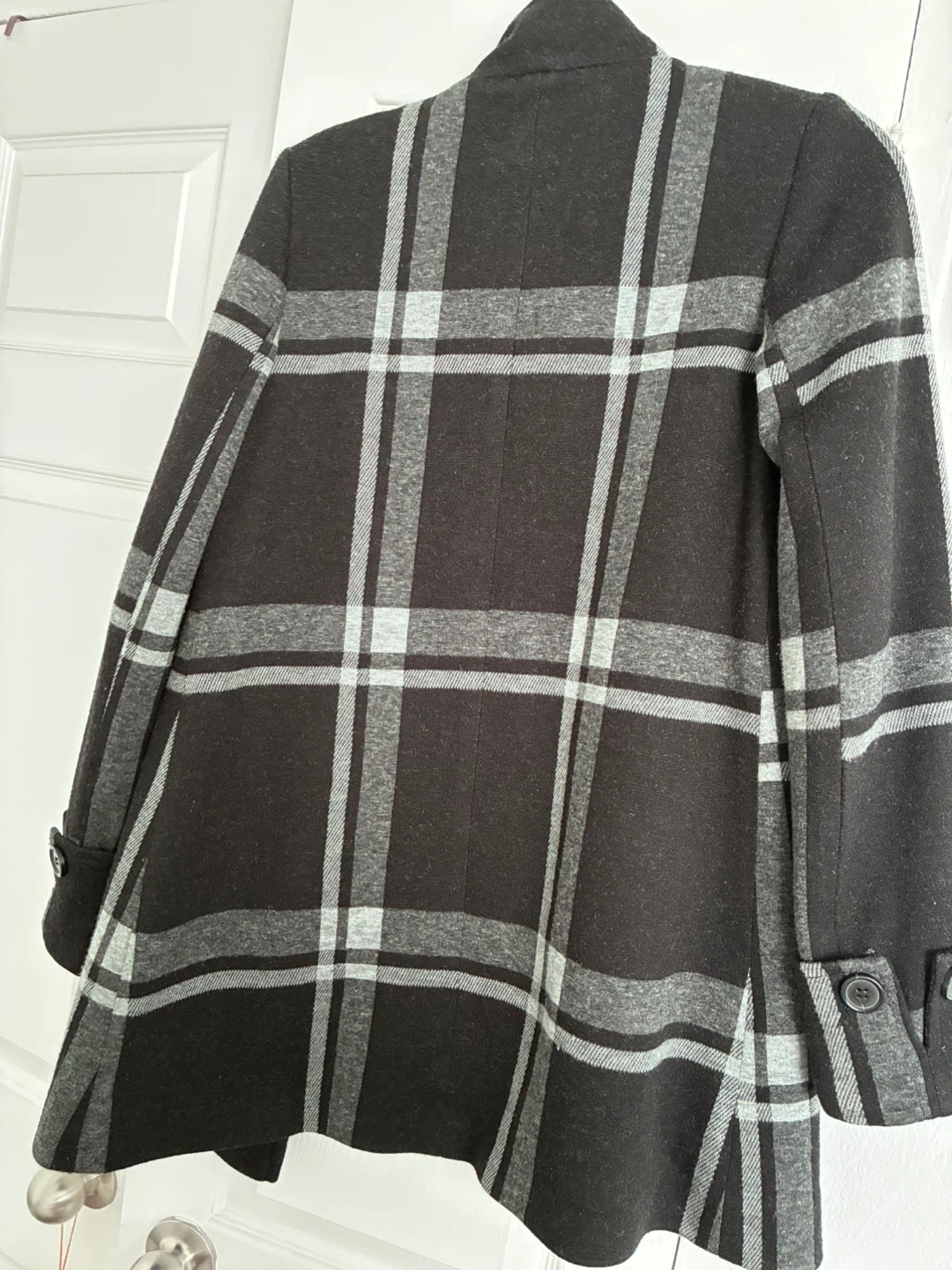 This Le Chateau coat features a classic plaid pattern in charcoal grey and light grey. It's a wool blend with button closures and two front pockets. It's a stylish choice for cooler weather!