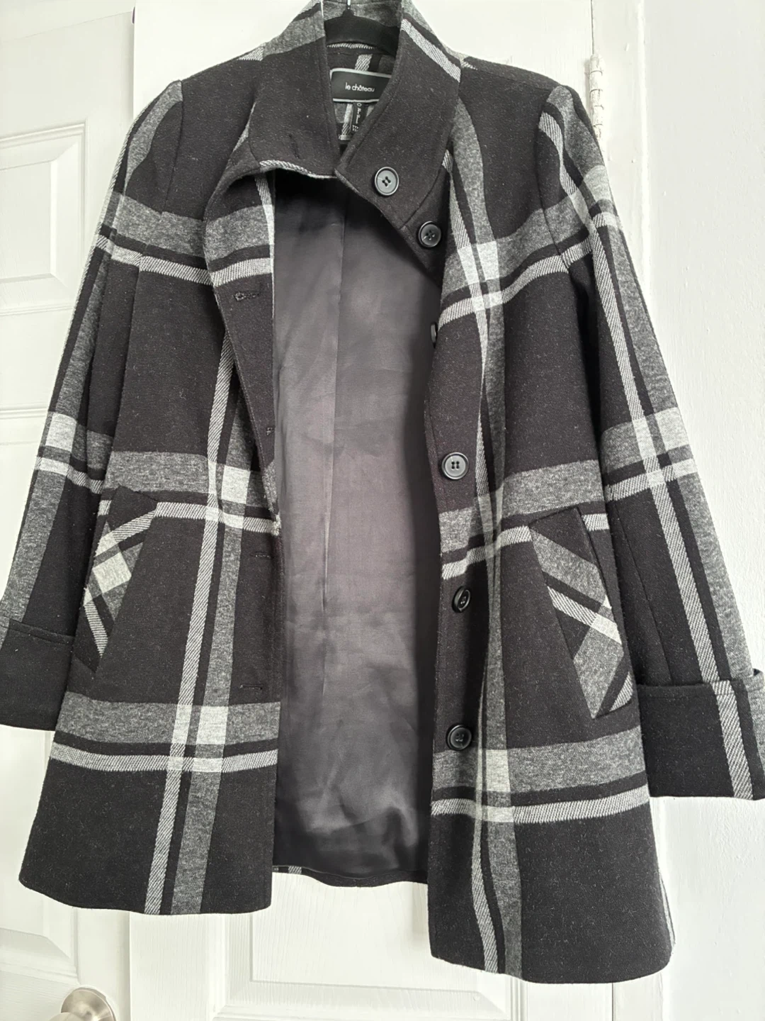 This Le Chateau coat features a classic plaid pattern in charcoal grey and light grey. It's a wool blend with button closures and two front pockets. It's a stylish choice for cooler weather!