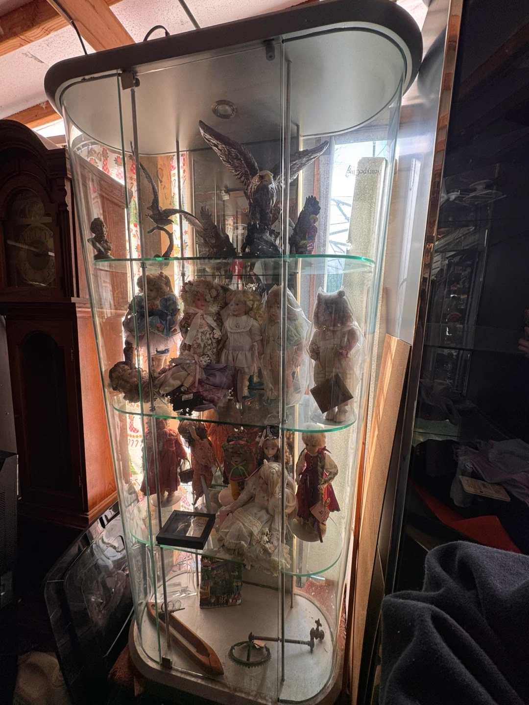 Curved glass display cabinet. Cabinet has wooden trim and shelves for displaying items. Perfect for collectors or showcasing cherished items!