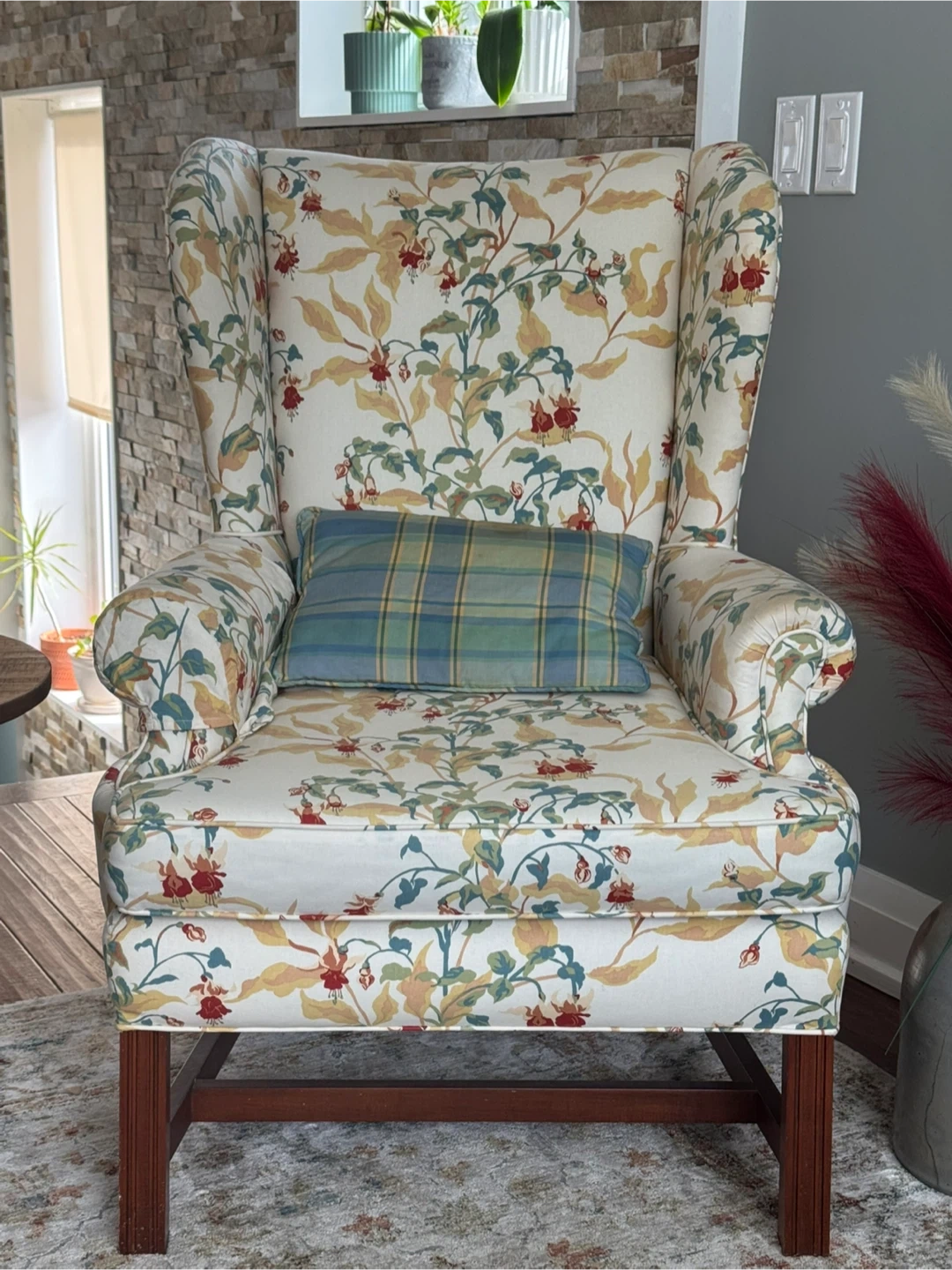 A comfortable wingback chair upholstered in a charming floral fabric. It features a blue and green plaid accent pillow. This chair would be lovely in a living room or bedroom!