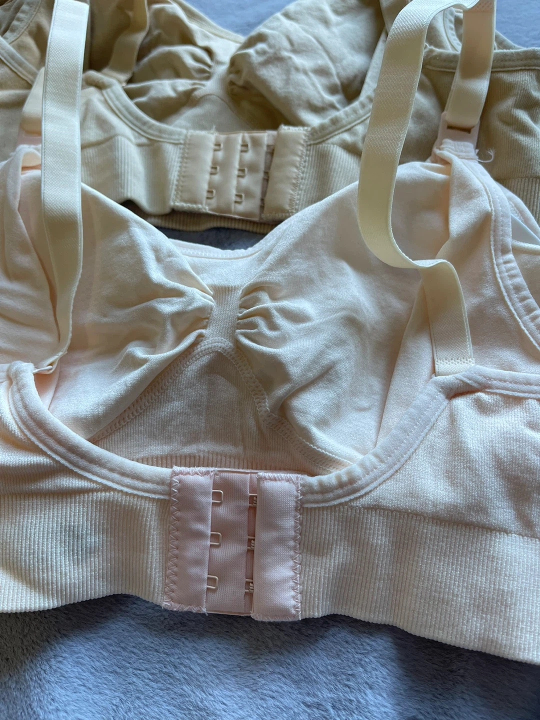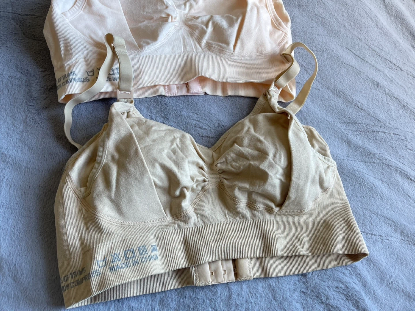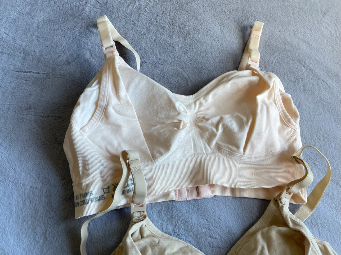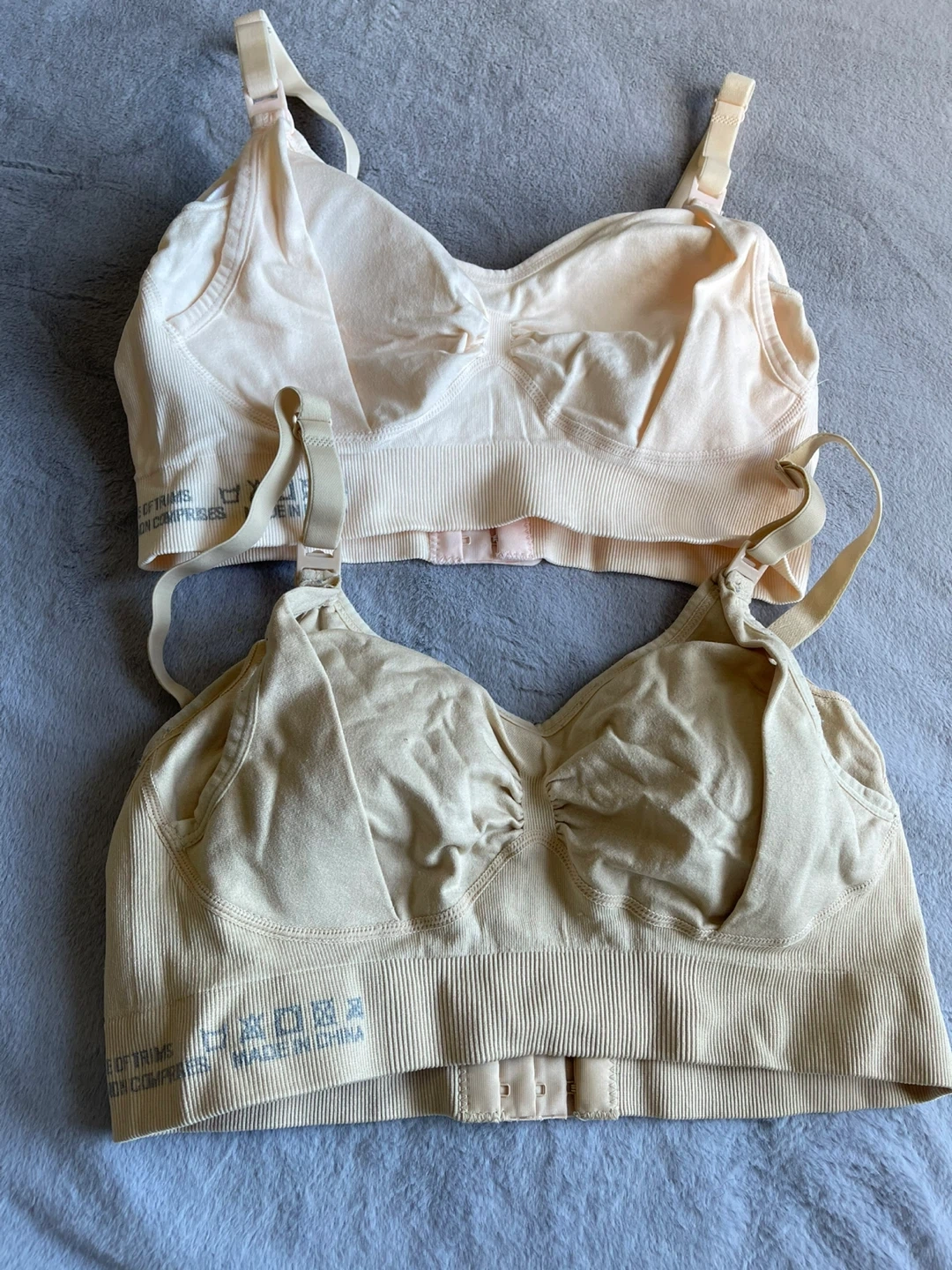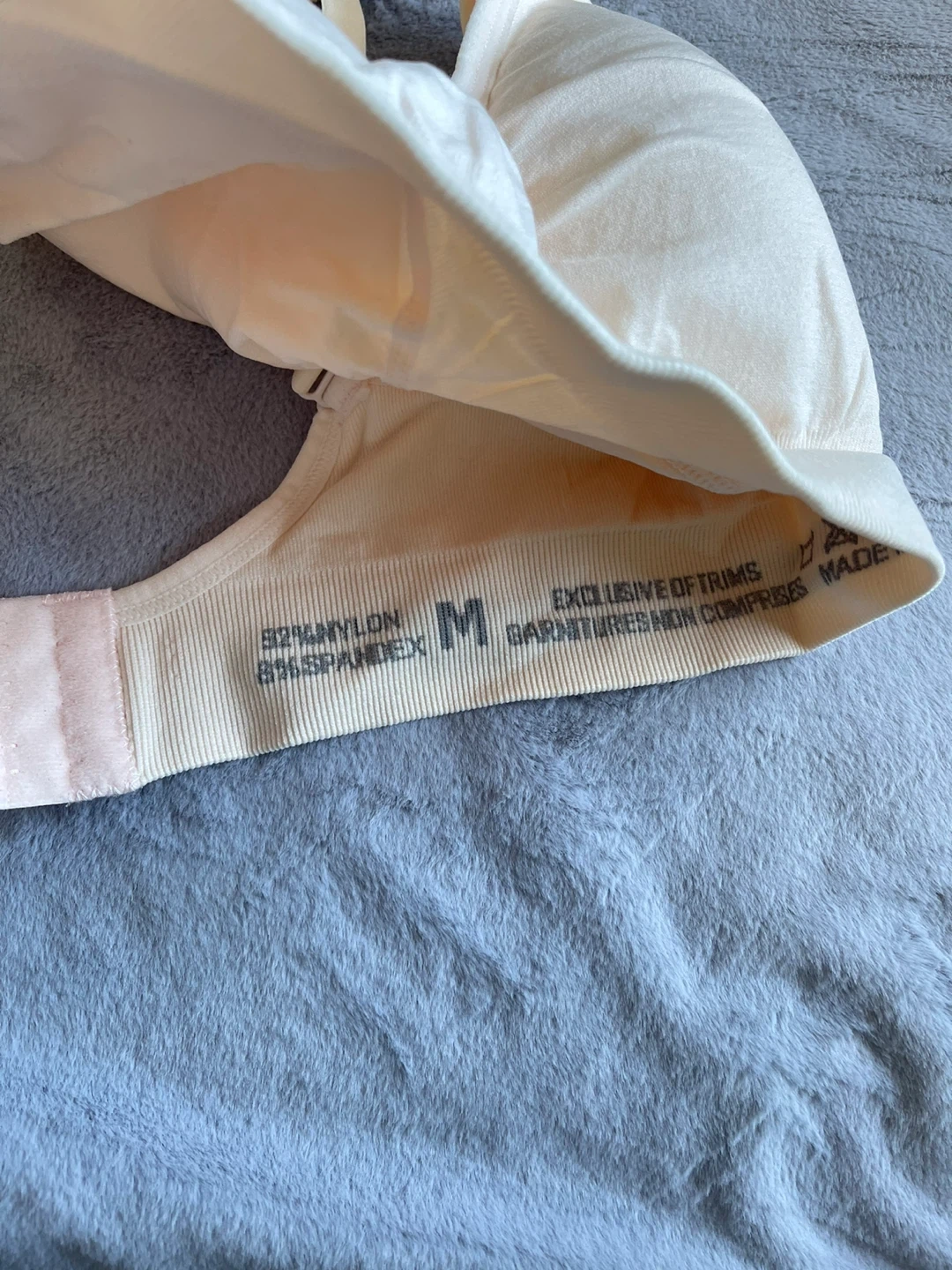 Two comfortable nursing bras included. One is beige, and the other is a creamy white colour. They're designed for ease of use and comfort. Made from a soft, stretchy fabric. The cream brand new And the beige used