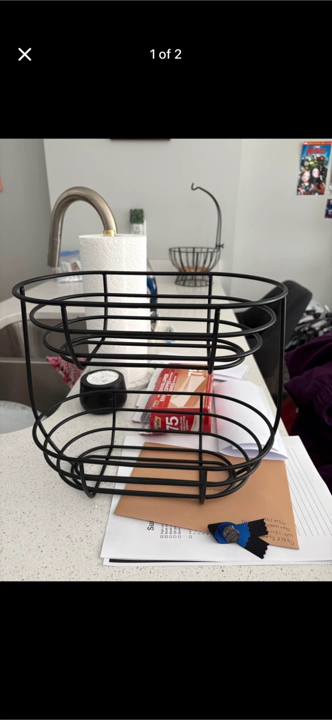 This is a black, two-tier wire basket. It's great for storing fruits, vegetables, or other kitchen items. The open wire design allows for good air circulation. Not used any more