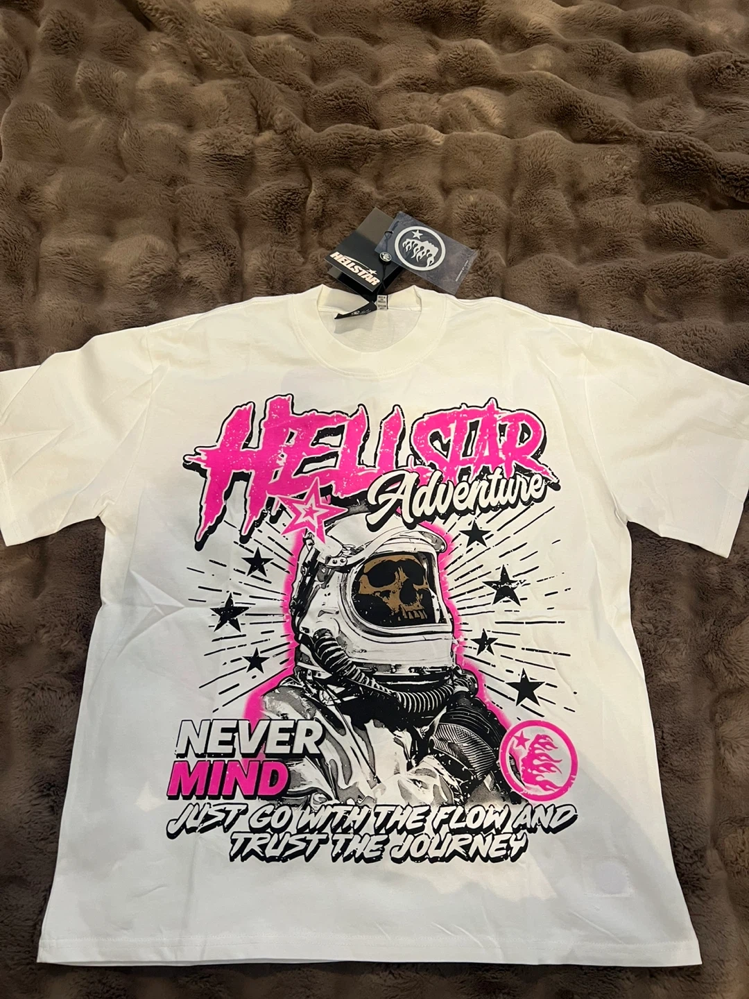 Brand new Hellstar "Never Mind" Adventure t-shirt. Features a graphic print on the front and back. Includes original tags.