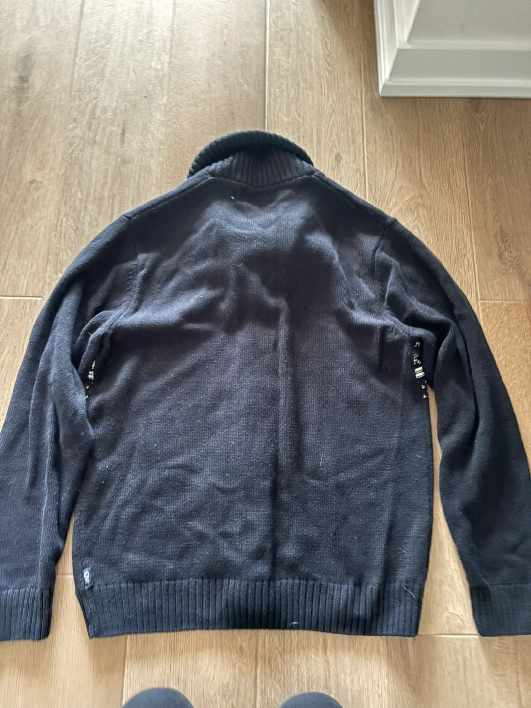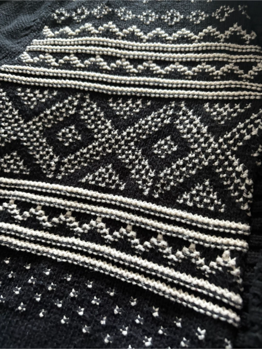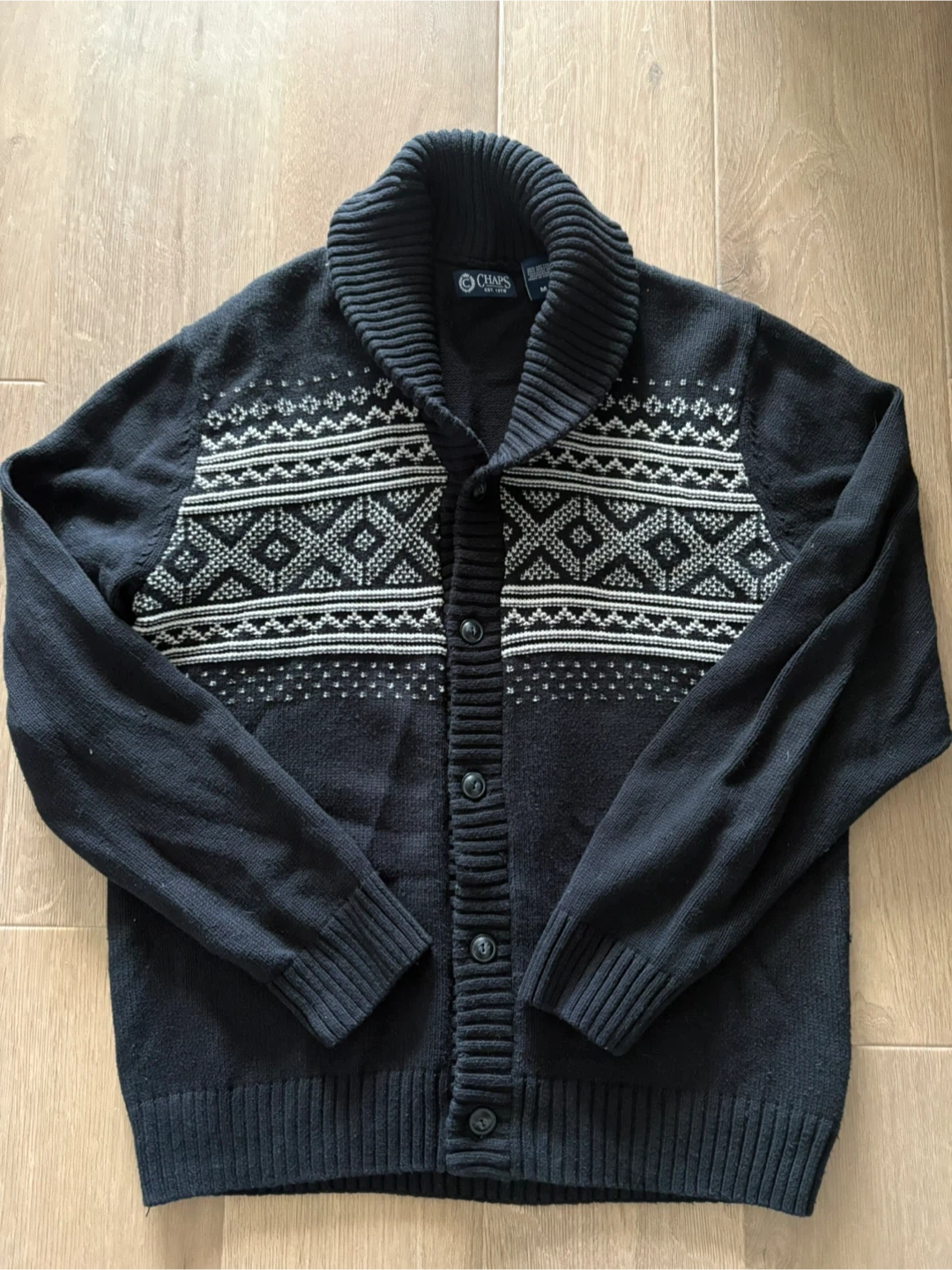 Chaps black cardigan sweater with a fair isle pattern. It's made of 60% cotton and 40% acrylic. Size is medium men’s. Measures 22” across and 27” from shoulder to bottom.