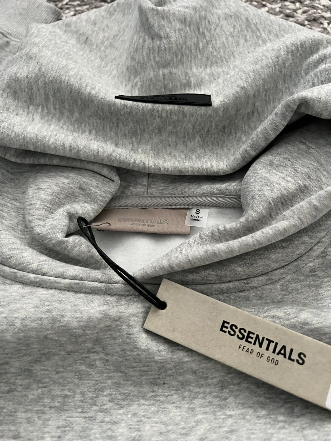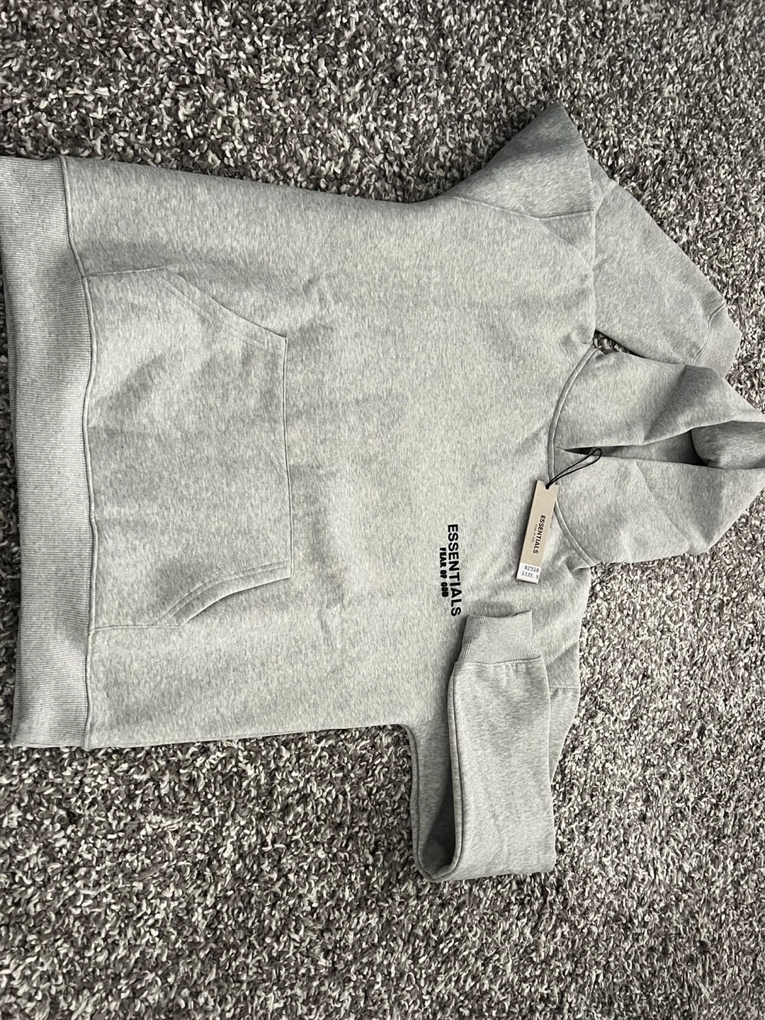 Grey ESSENTIALS hoodie with a front pouch pocket. Size small and made in Vietnam. It's a comfortable pullover style. Great for casual wear!