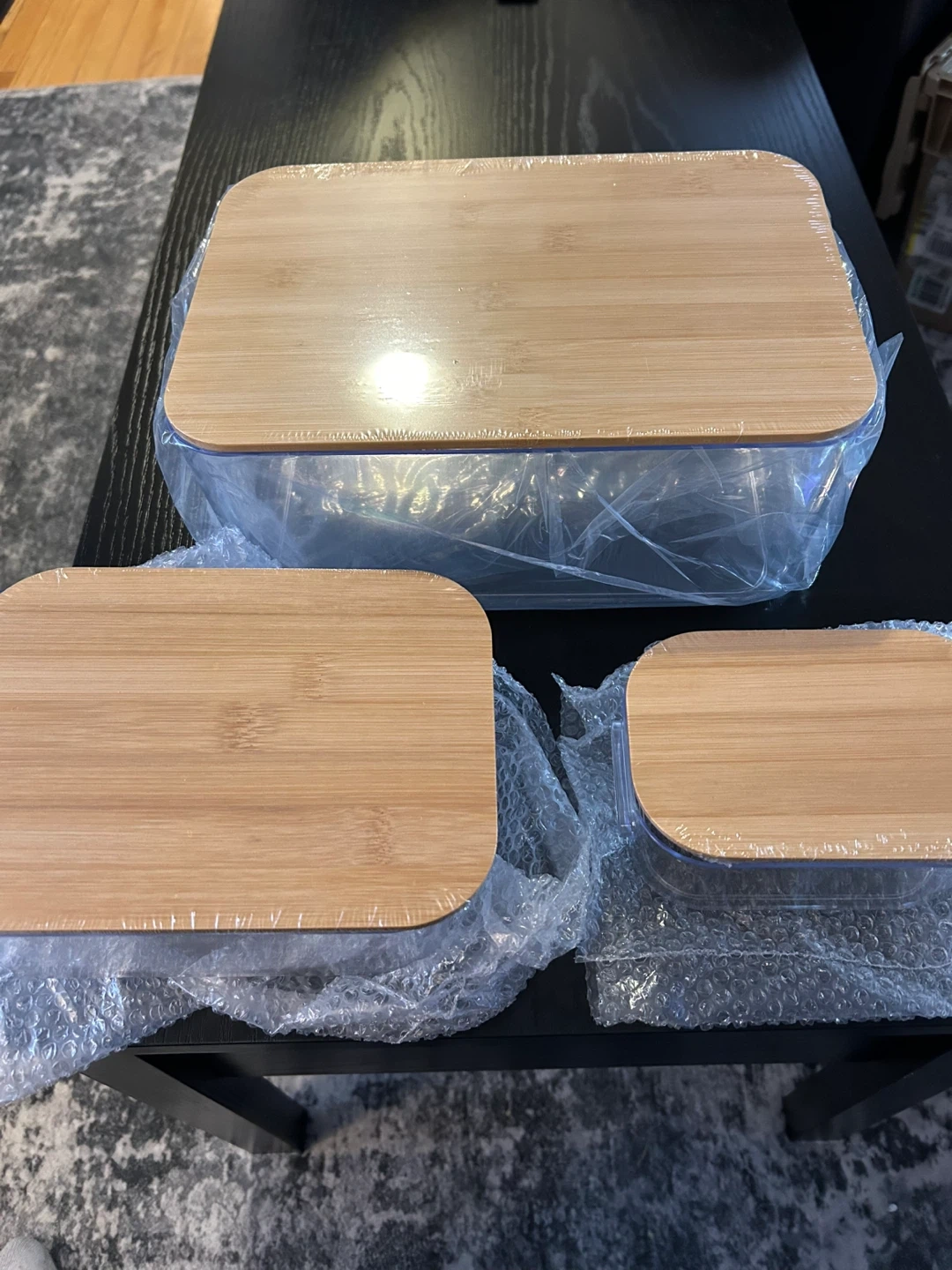 This is a set of four storage bins. They come with bamboo lids. The dimensions are in pictures These are great for organizing small items.