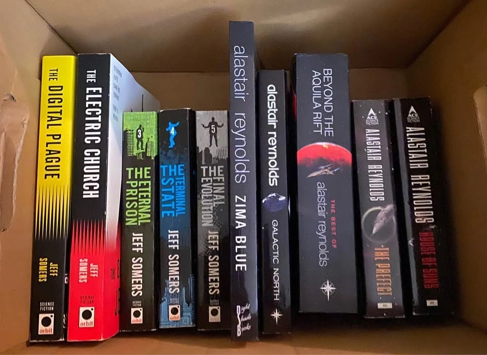 Pic 10: Jeff Somers - 5 books at $5 each; Reynolds - Zima and Beyond the Aquila for $8 each; 3 books at $5 each.