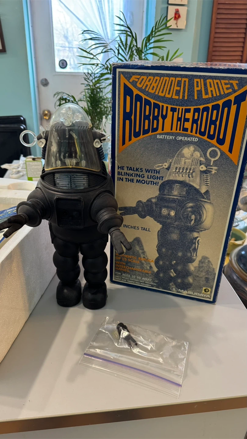 Masudaya Robby the Robot from Forbidden Planet. It's an authentic 1/5 scale replica and is missing parts (extra hands, ray gun). 16” high.