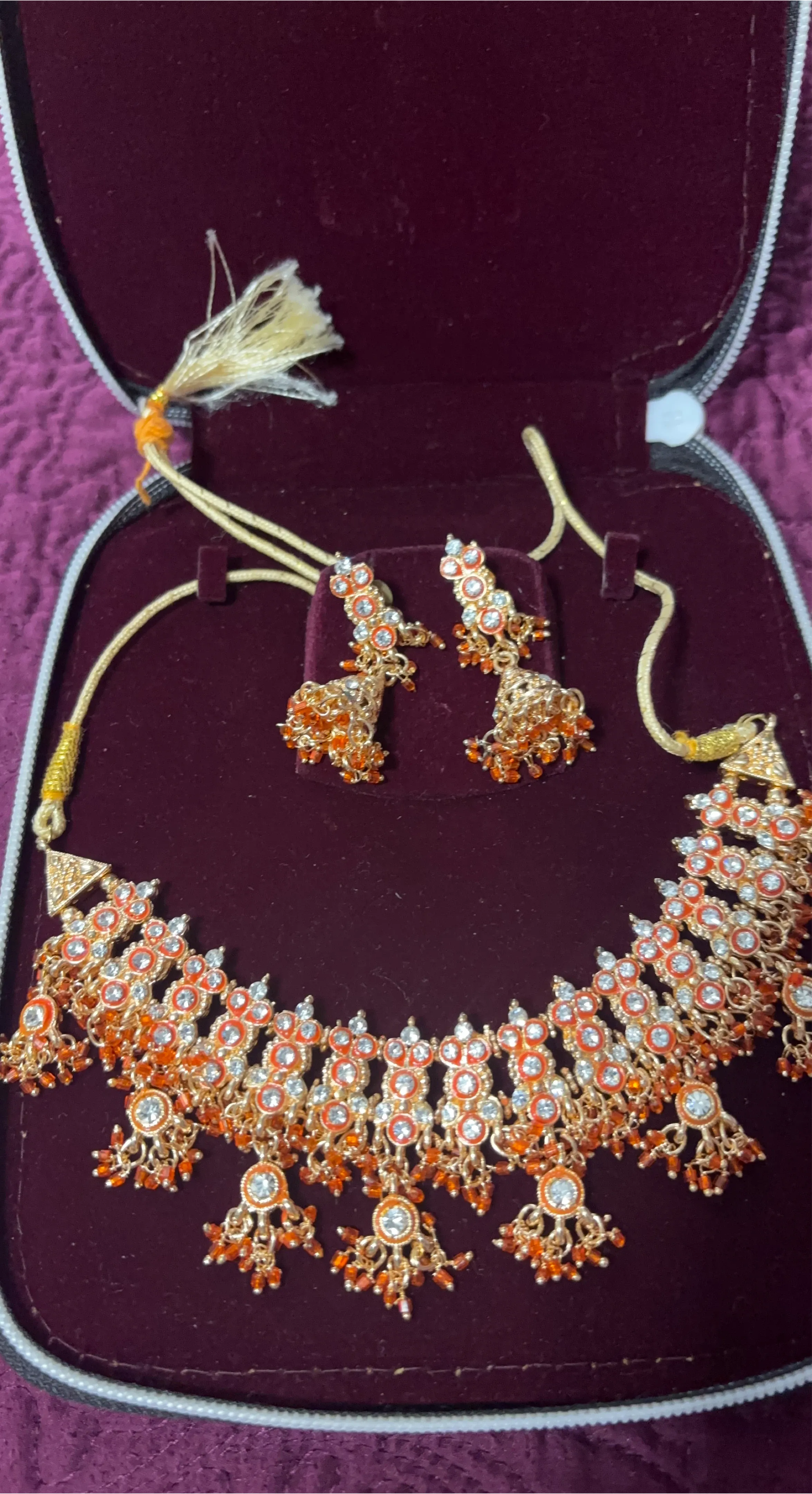 This set includes a chokers-style necklace and matching earrings. It's adorned with clear and orange beads. The necklace has a tassel detail on the tie strings.