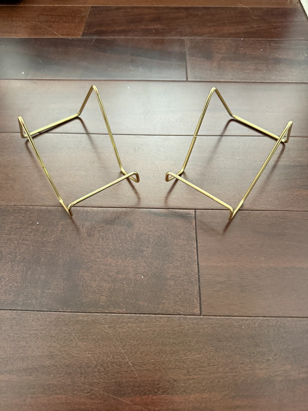 8 Gold-coloured metal display stands. We used these for our wedding and displayed these tiny wood plaques on them as you can see in the second picture. These stands are perfect for showcasing smaller items like plates, canvases, or small pictures. I believe they are about 3” wide.
