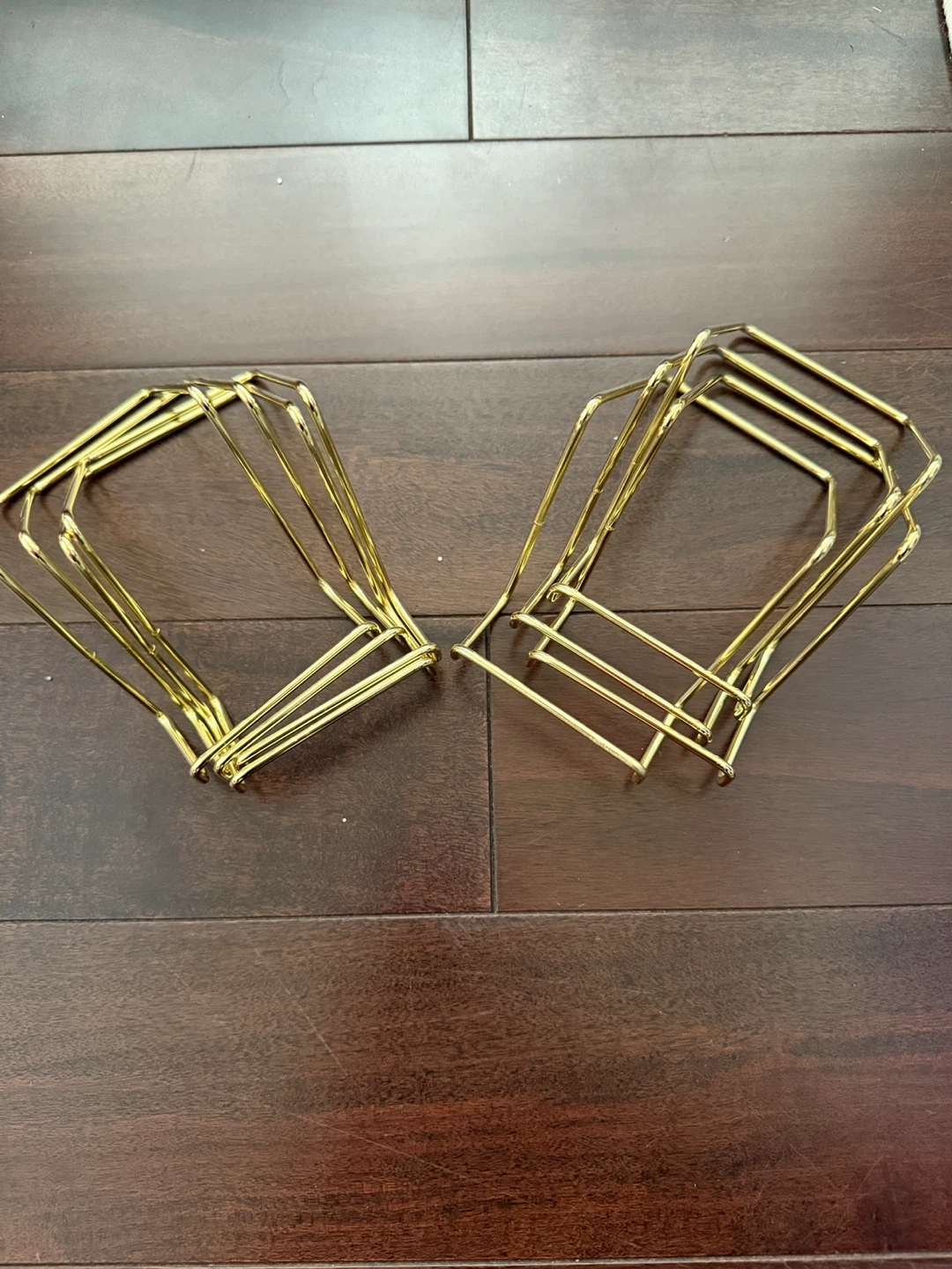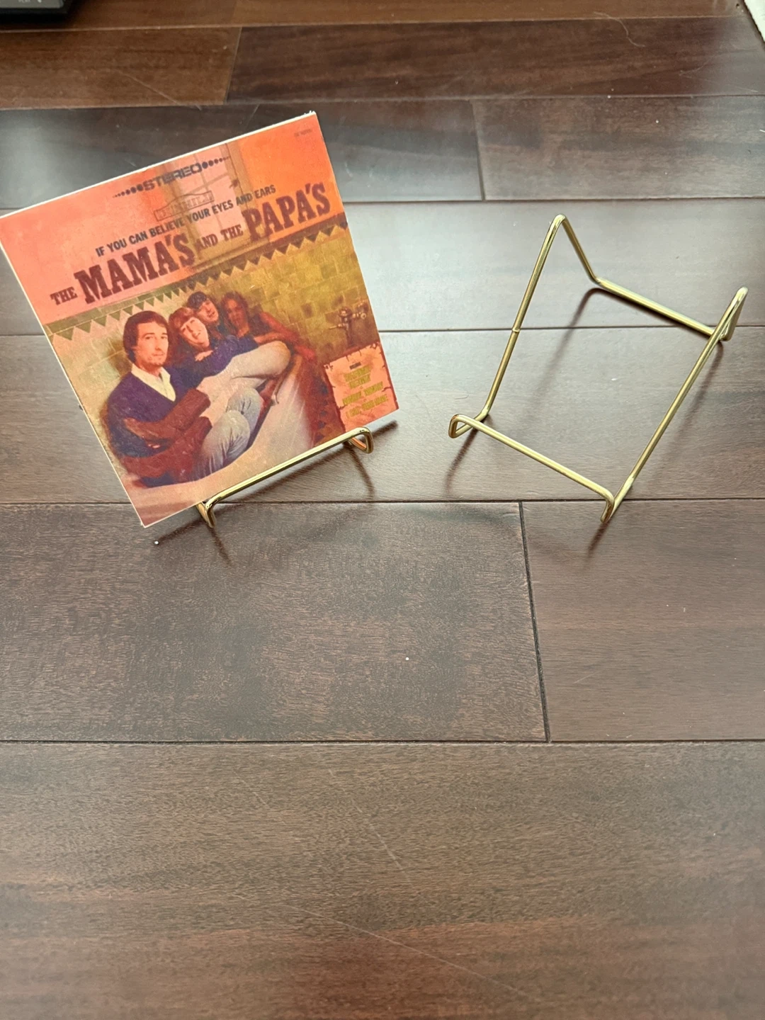 8 Gold-coloured metal display stands. We used these for our wedding and displayed these tiny wood plaques on them as you can see in the second picture. These stands are perfect for showcasing smaller items like plates, canvases, or small pictures. I believe they are about 3” wide.