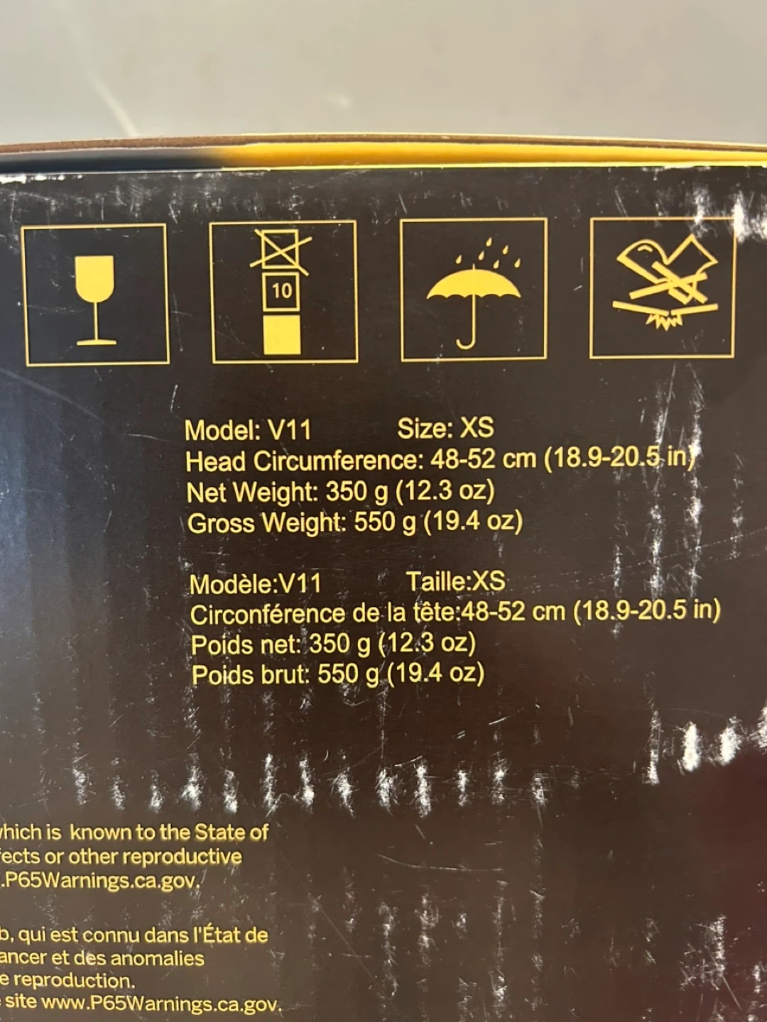 This is a Ninebot V11 helmet in black, size XS. Head circumference is 48-52 cm (18.9-20.5 in). Net weight is 350g (12.3 oz).