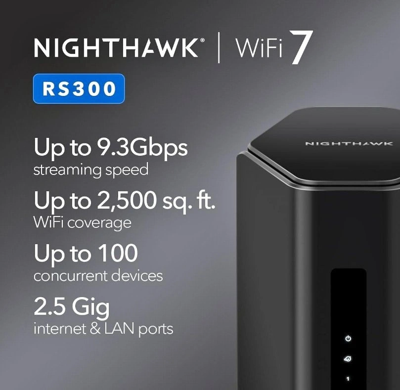 Blazing-fast WiFi 7 speeds up to 9.3Gbps for gaming, smooth streaming, video conferencing, and entertainment. WiFi 7 delivers 2.4x faster speeds than WiFi 6 to maximize performance across all devices. NETGEAR routers come with security measures built in, including automatic firmware updates. Our Advanced Router Protection enables enhanced safety features and updates designed to help protect you and your family. Sleek new body with a smaller footprint and high-performance antennas for up to 2,500 sq. ft. of WiFi coverage. 2.5 Gig internet port enables multi-gig speeds with the latest cable or fiber internet service plans. 2 x 2.5 Gig and 2 x 1 Gig Ethernet LAN ports for fast wired connections. NETGEAR Armor provides a powerful suite of tools to help keep you safe online, including enhanced protection against hackers, malware, and identity theft, at home or on the go. Includes a 30-day trial. Easily set up and manage your WiFi with the Nighthawk app.