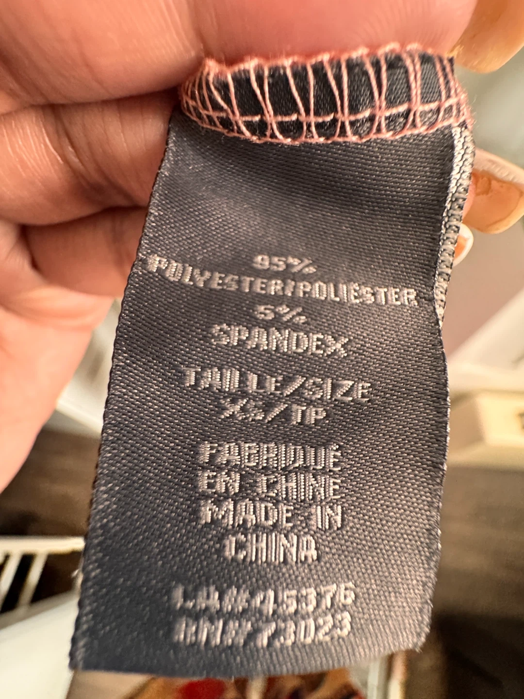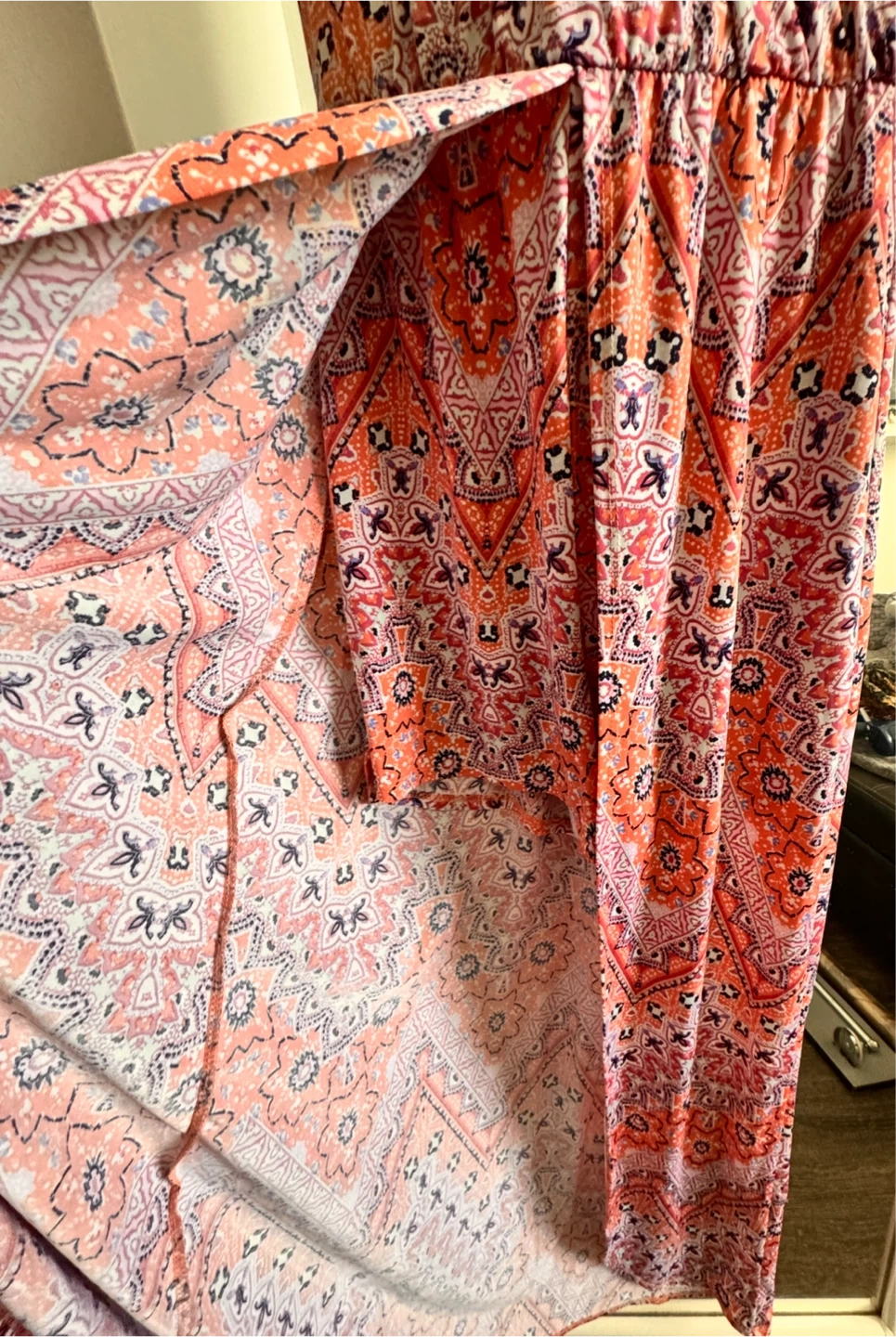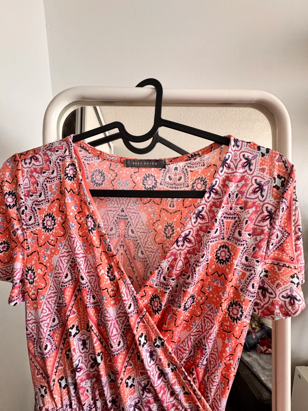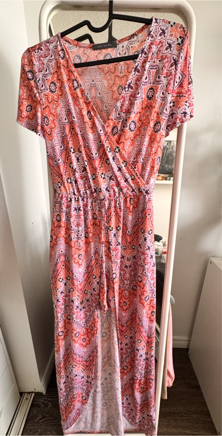 This is a Suzy Shier maxi dress in an extra small size. It's made from 95% polyester and 5% spandex. The dress has a colourful, patterned design.