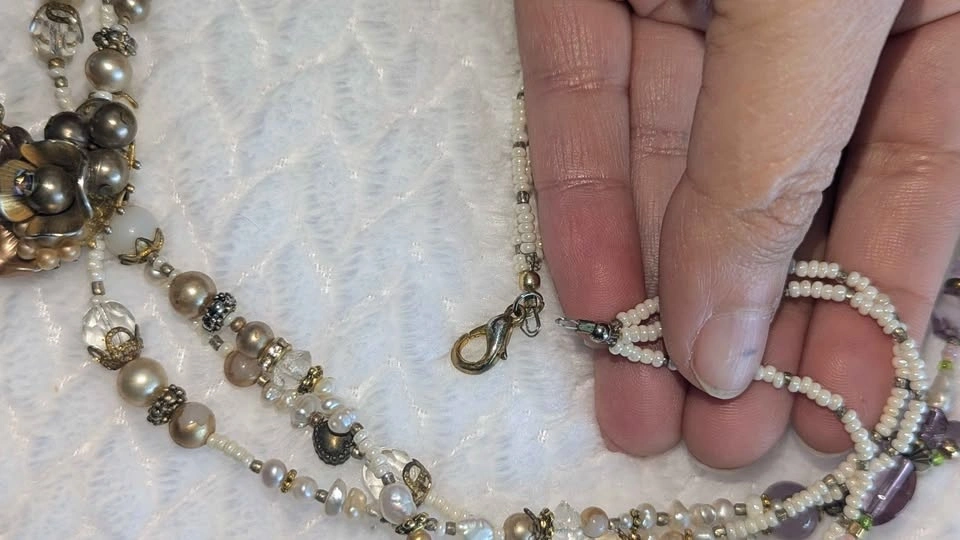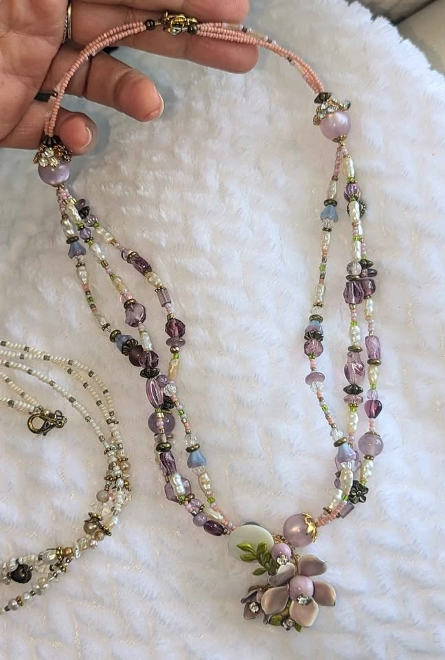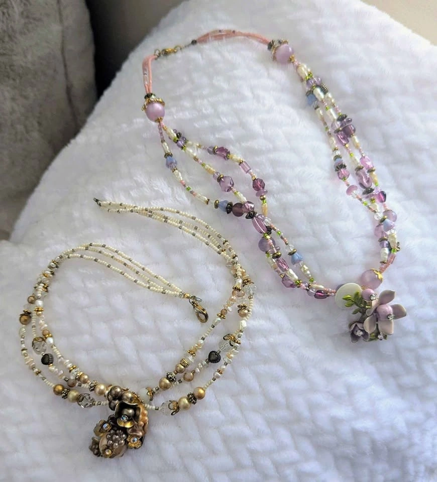 Beautiful handmade beaded necklaces with floral motifs and gorgeous jeweled resin charms. Please note one side of the clasp is missing on the white one; a simple O-ring is needed. Sold as a set only. Two for $40.