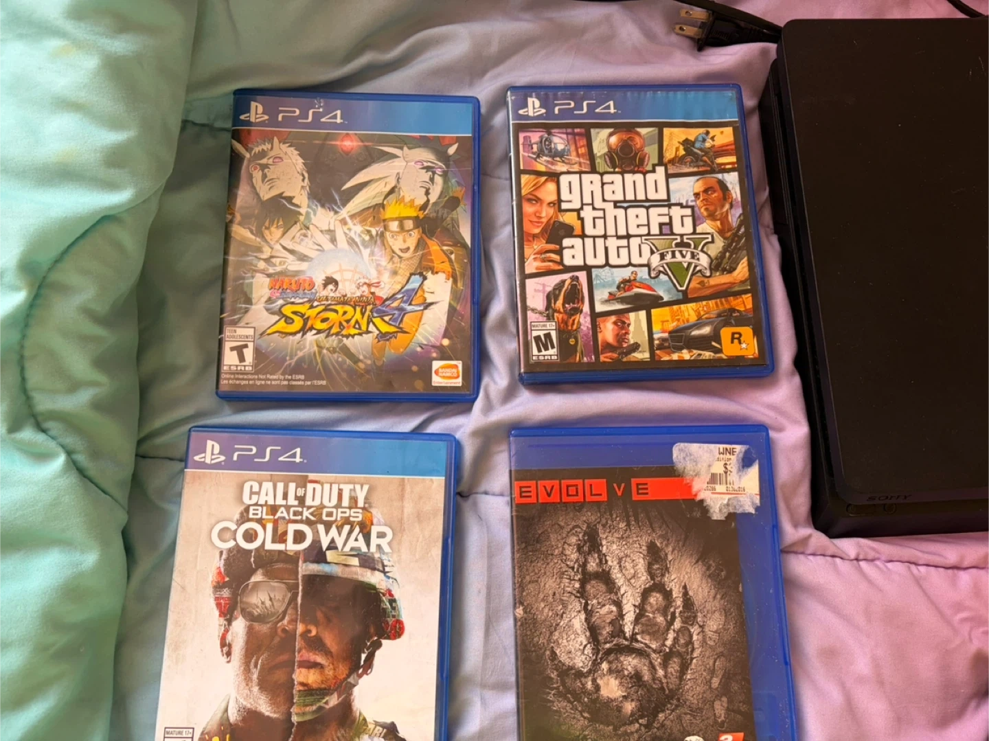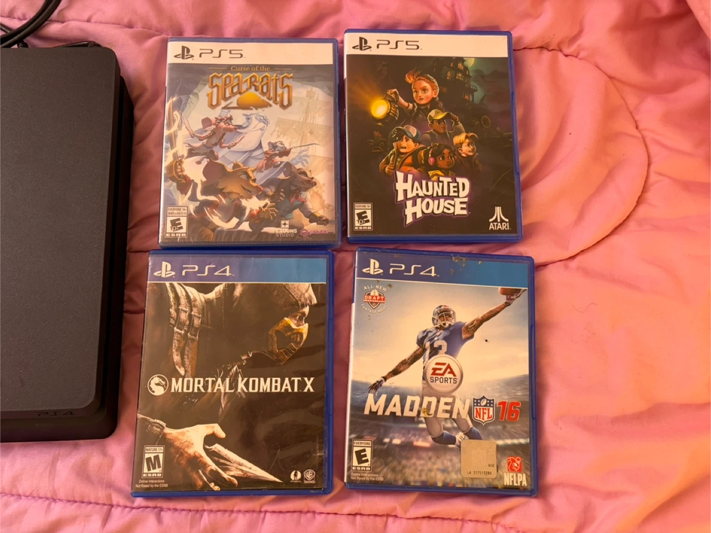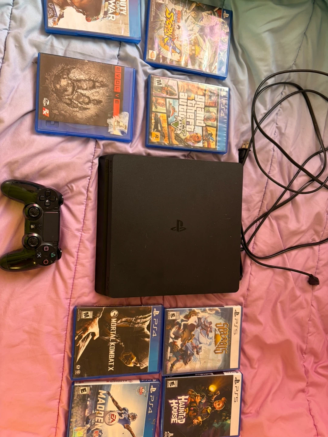 Selling my PS4 Slim in great working condition. No issues at all — turns on, plays games, and runs smooth. Includes everything shown: ✔ PS4 Slim console ✔ 1 DualShock controller ✔ Power cable + HDMI ✔ 8 games: • GTA V • Cold War • Mortal Kombat X • Naruto Storm 4 • Madden • Evolve • Curse of the Sea Rats (PS5) • Haunted House (PS5) System is clean, wiped, and ready to use. Perfect bundle for someone who wants a full setup. Pickup in East New York Price negotiable Need gone ASAP