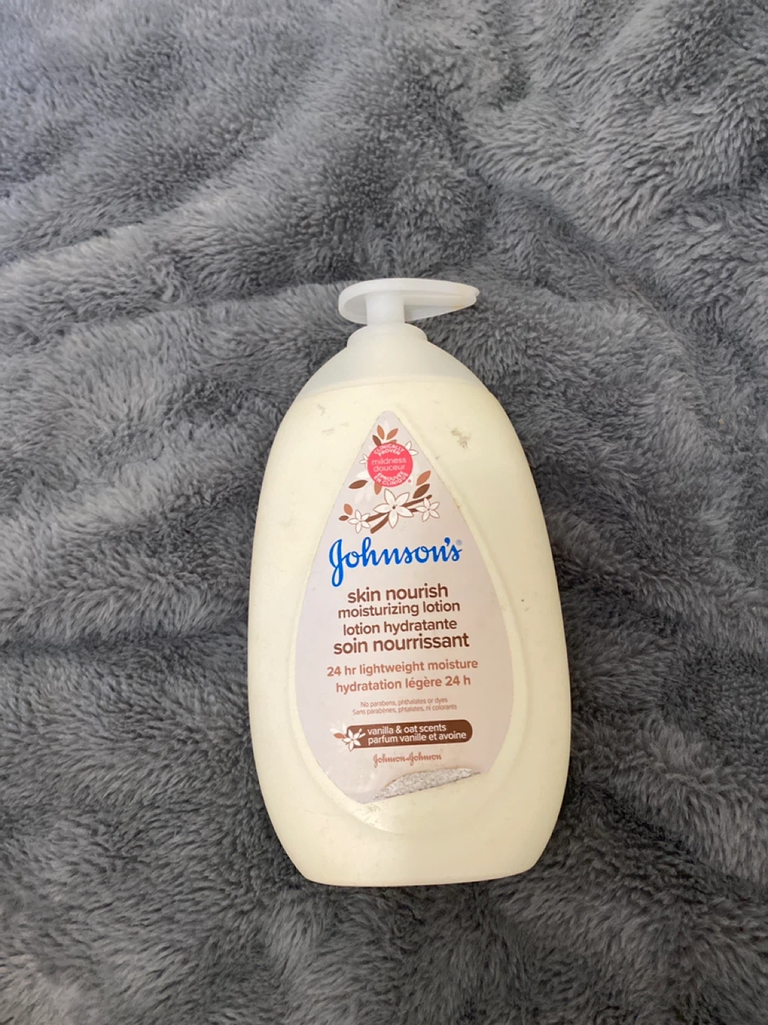 Johnson's skin nourish moisturizing lotion in vanilla & oat scent. It's a 24 hr lightweight moisture lotion. No parabens, phthalates or dyes.