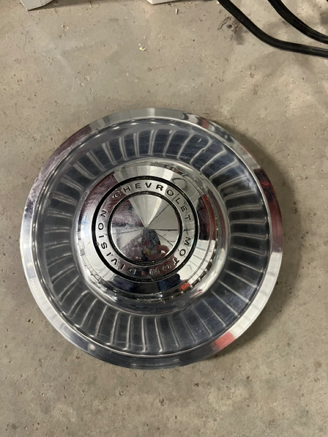 Chrome Chevrolet hubcap for your classic car. It's made of metal and shows some signs of wear. Fits most Chevrolet vehicles from the mid-century.