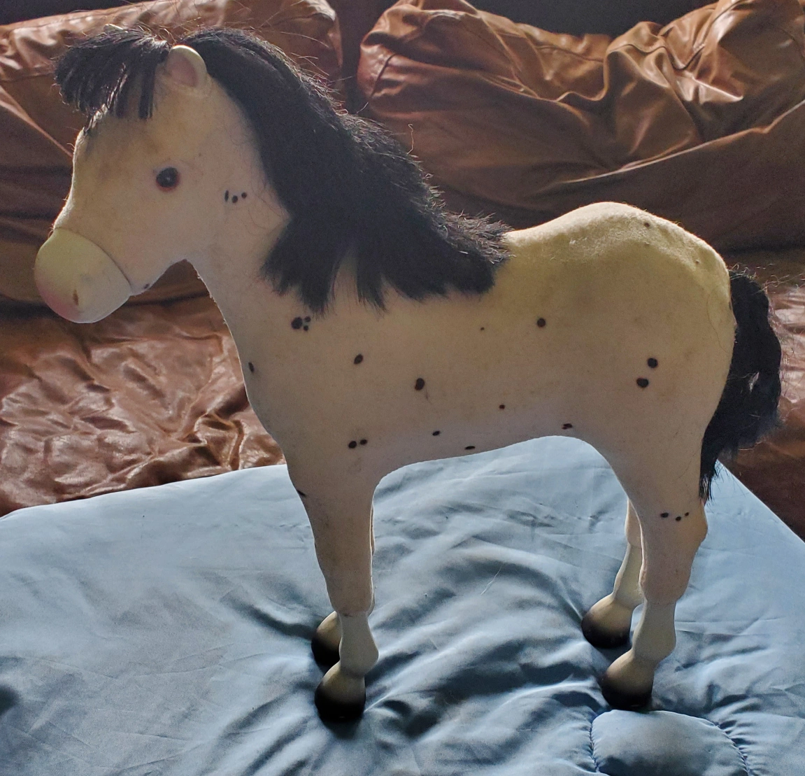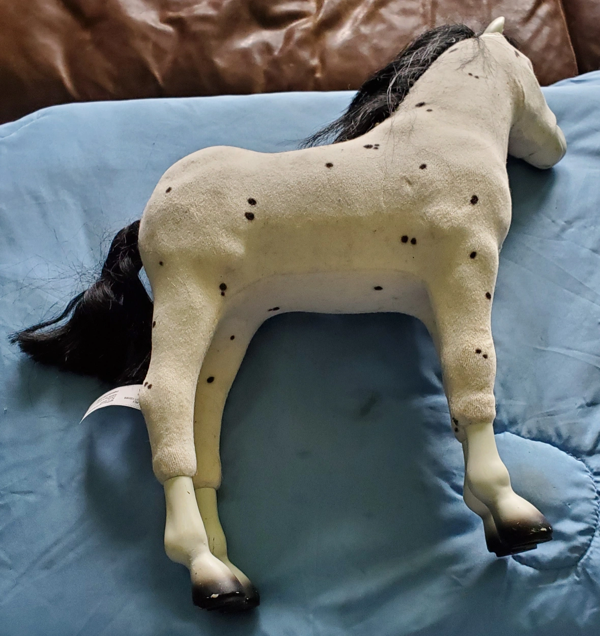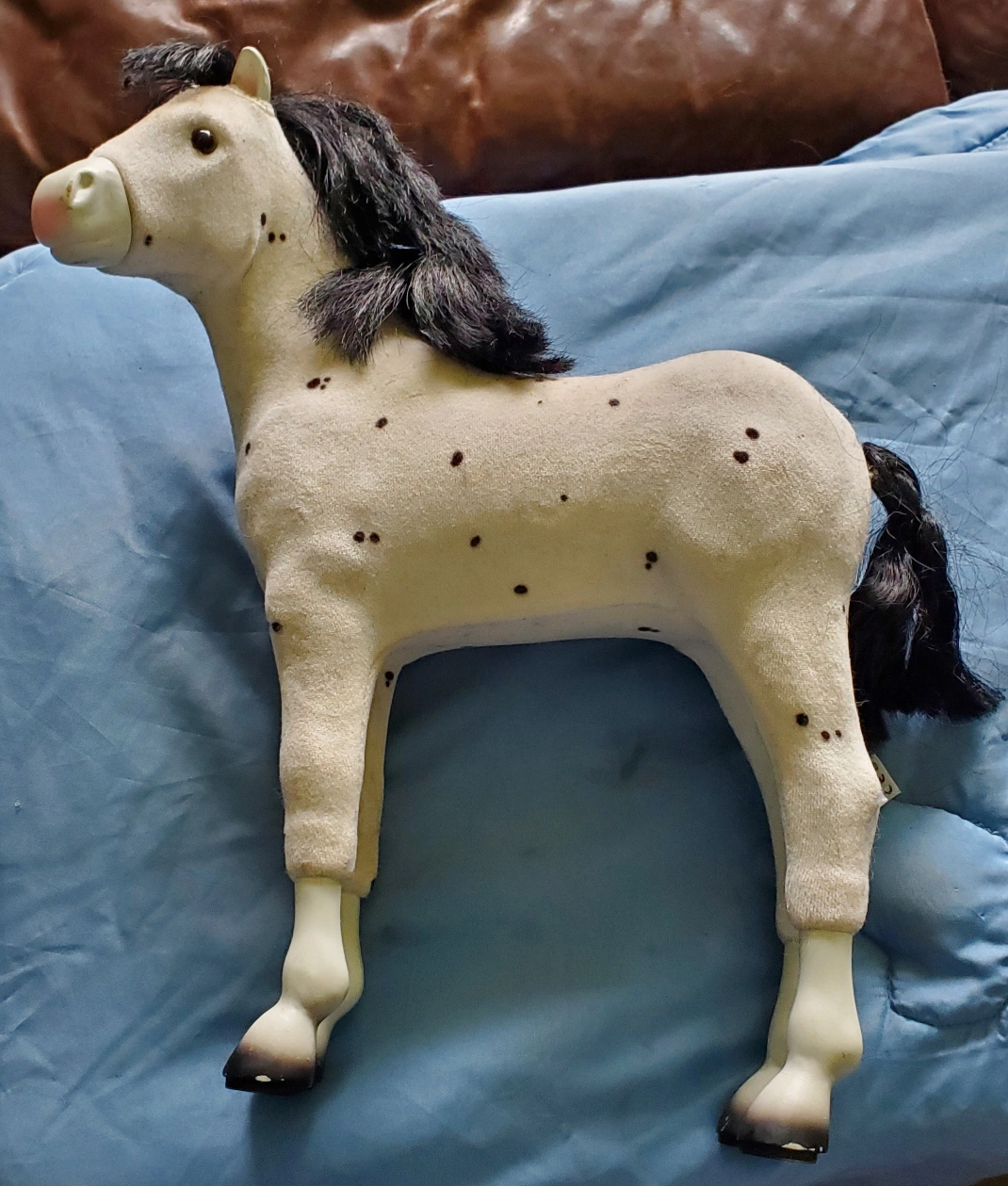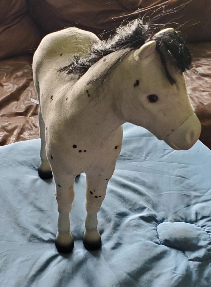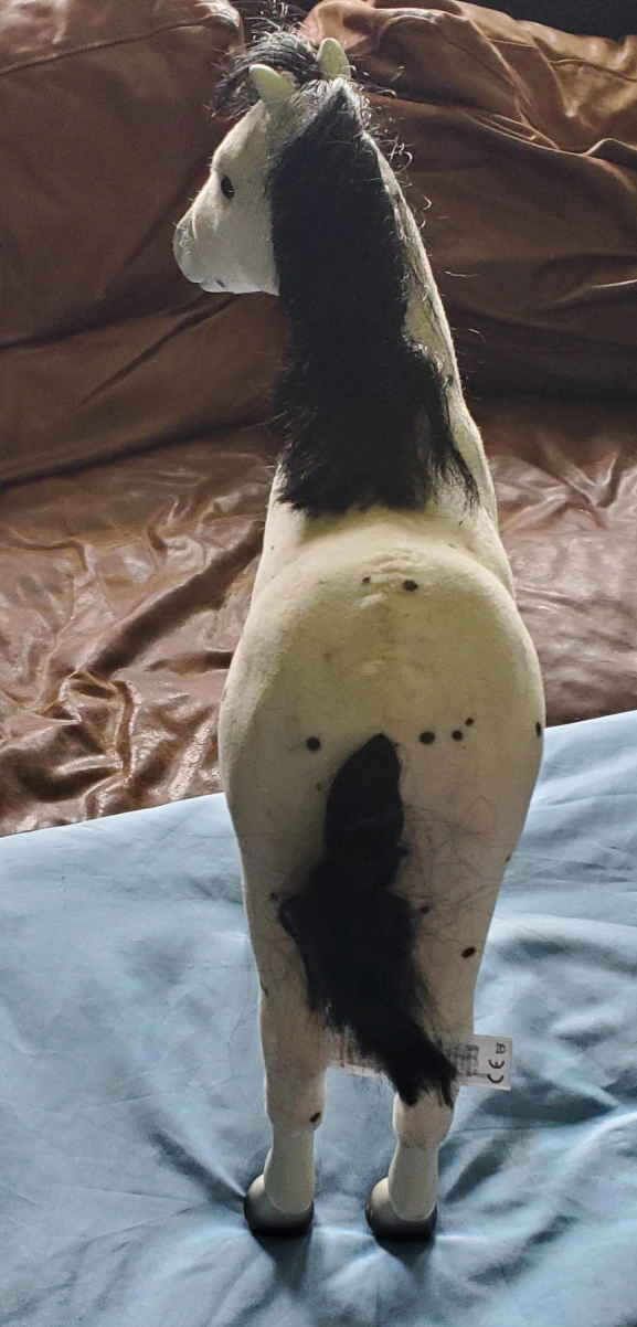 Foal features white short flocked fabric covering white plastic base; ears and legs are left uncovered. Black spots along coat. Black airbrushed lower legs and hooves; pink around muzzle. Black eyes. Black mane and tail.