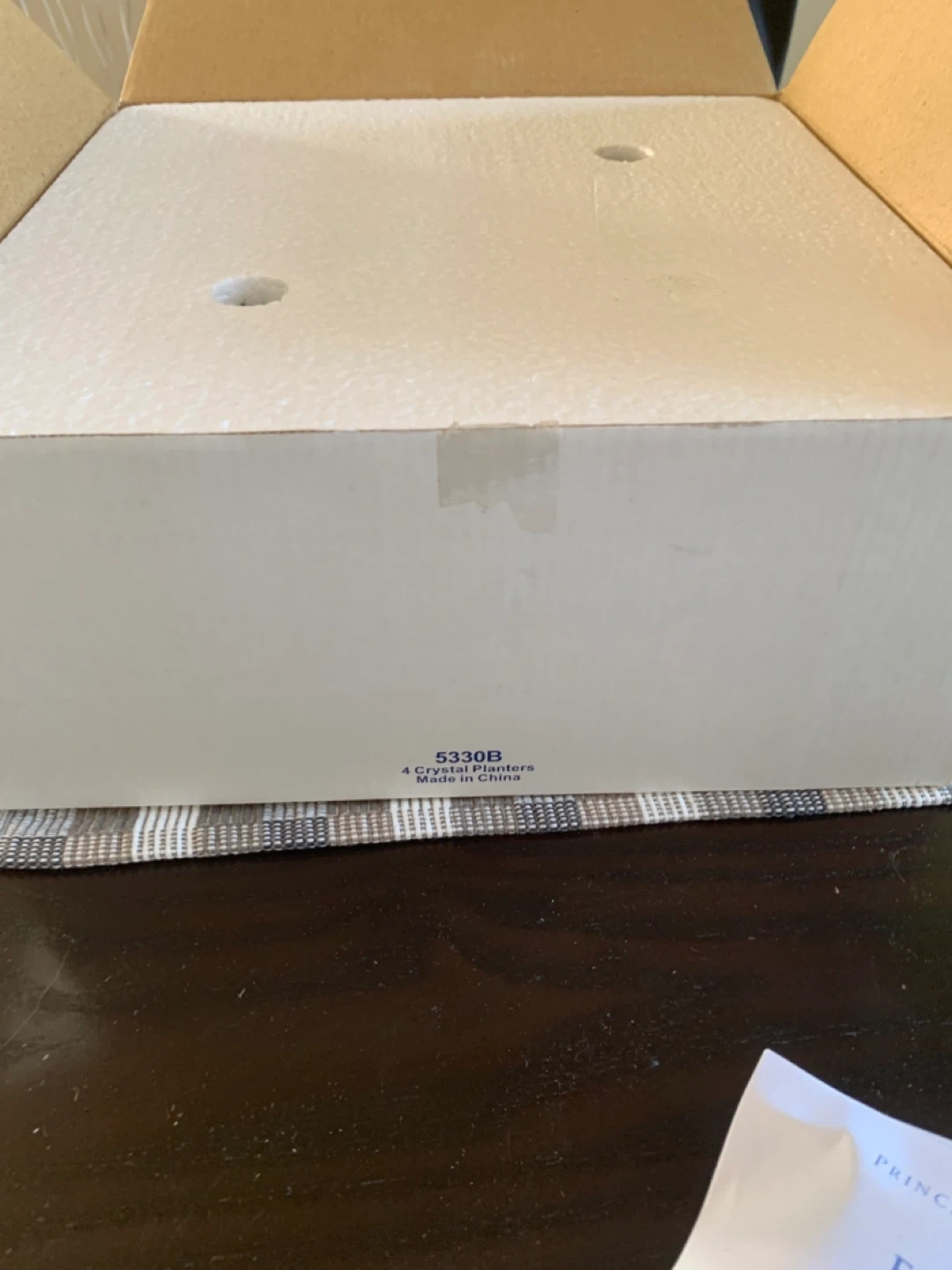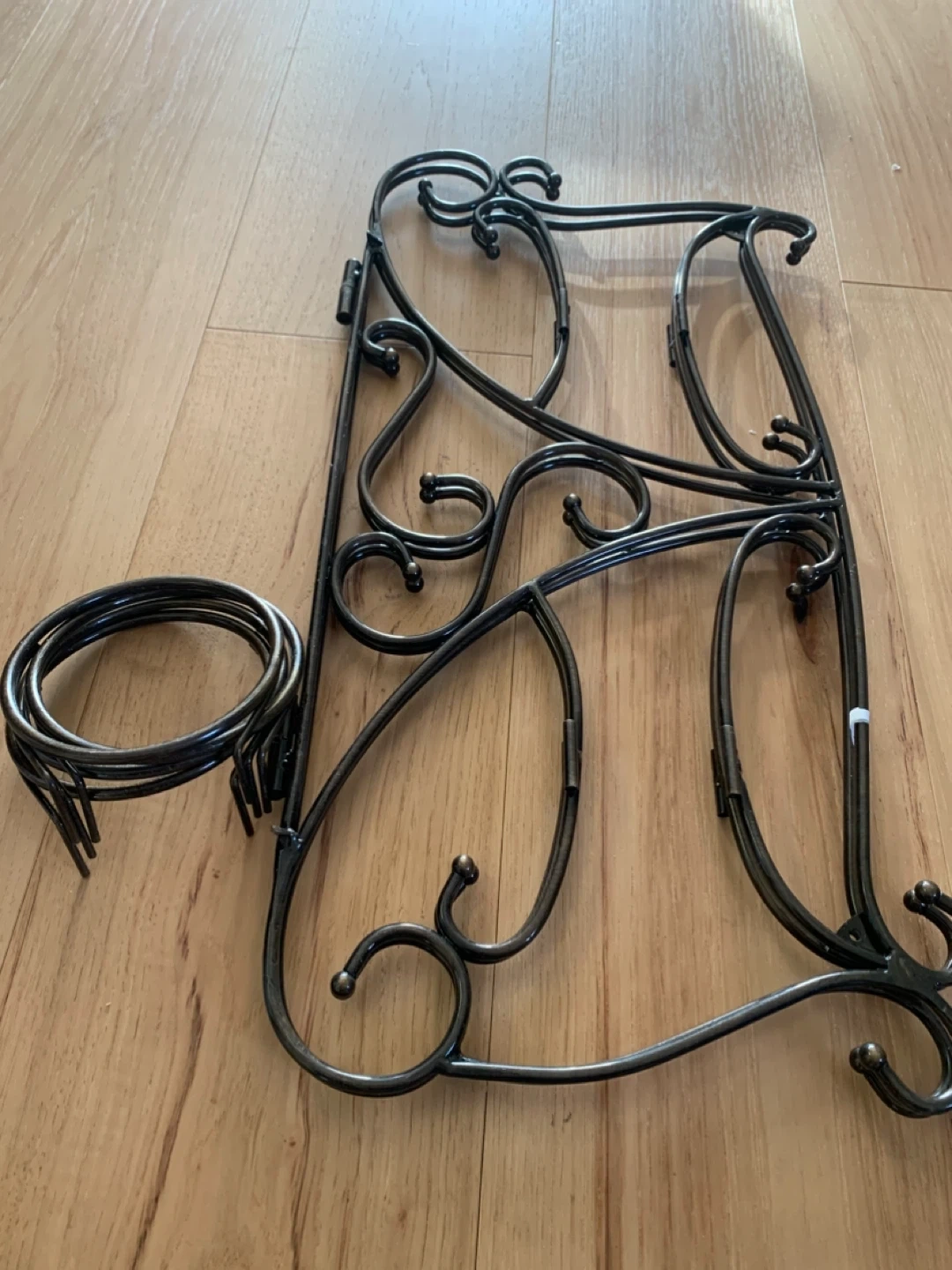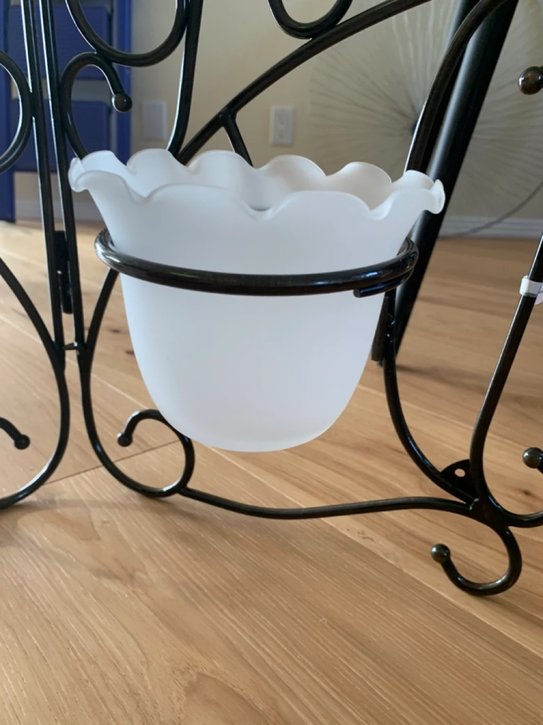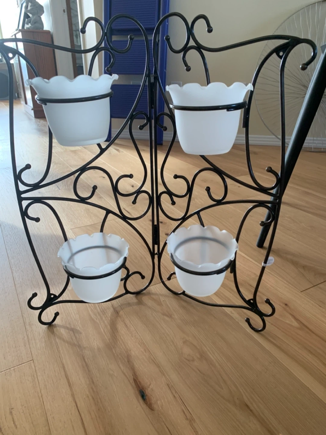 This Princess House plant stand features four frosted crystal cups for your plants. The metal stand has an ornate scroll design. It's a lovely way to display your greenery indoors or out. It's made with fine crystal components.