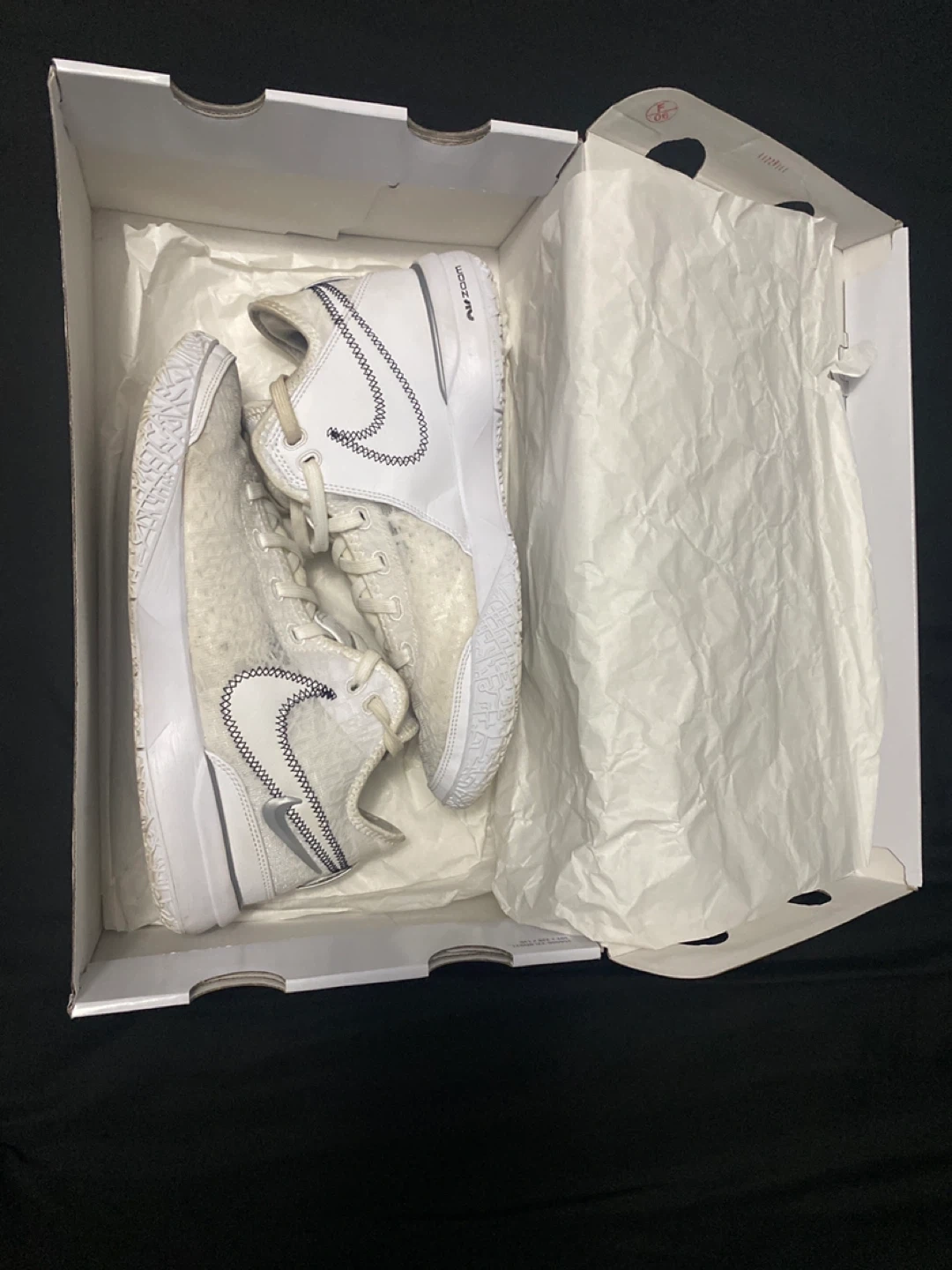 White Nike LeBron Witness 8 basketball shoes. Includes original box. These shoes are designed for performance on the court. Good for indoor court play.