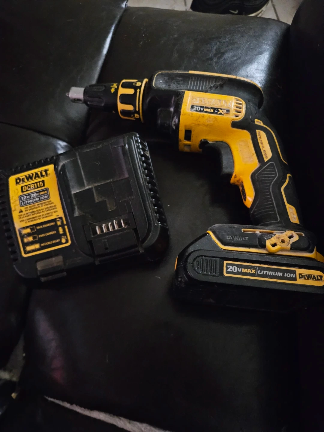 DeWalt 20V MAX cordless drywall drill with DCB115 charger and 20V MAX Lithium Ion battery. Brushless motor. This tool is great for DIY projects and construction work.