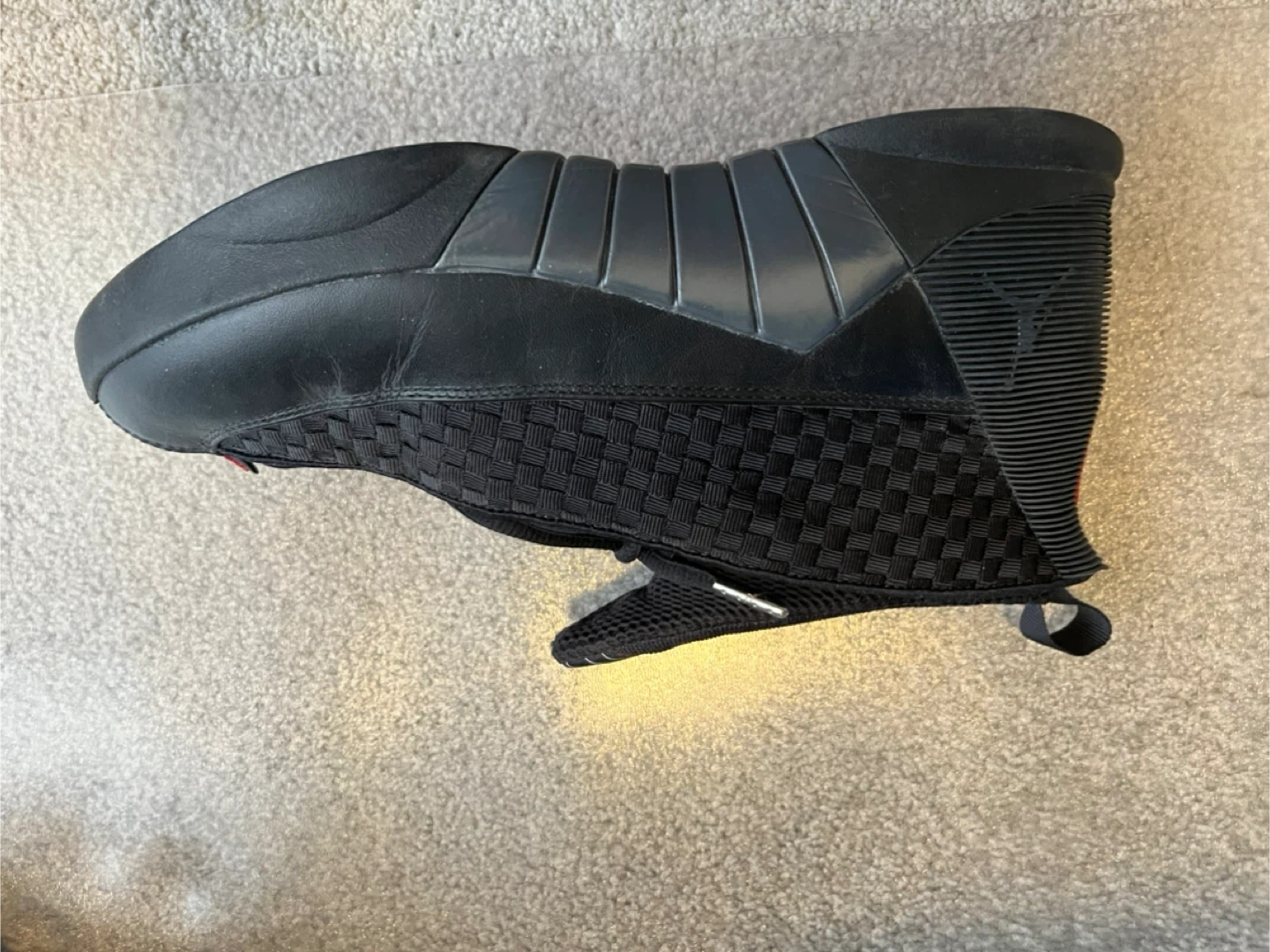 Black Air Jordan XV 15 basketball shoes. Features a woven textile upper and ribbed heel detailing. These sneakers offer a distinctive silhouette for any collector.