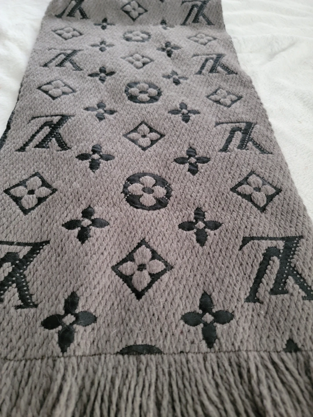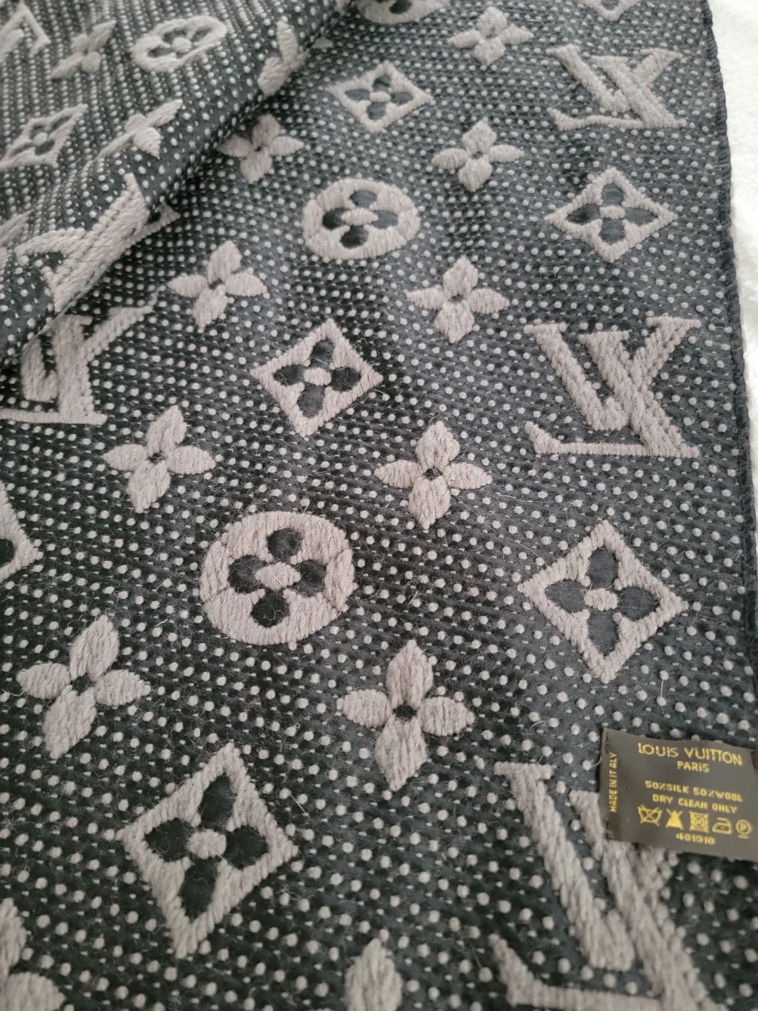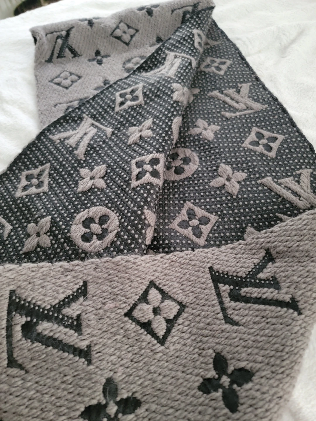 Louis Vuitton scarf made with a silk and wool blend. Features the iconic LV monogram pattern throughout. Dry clean only.