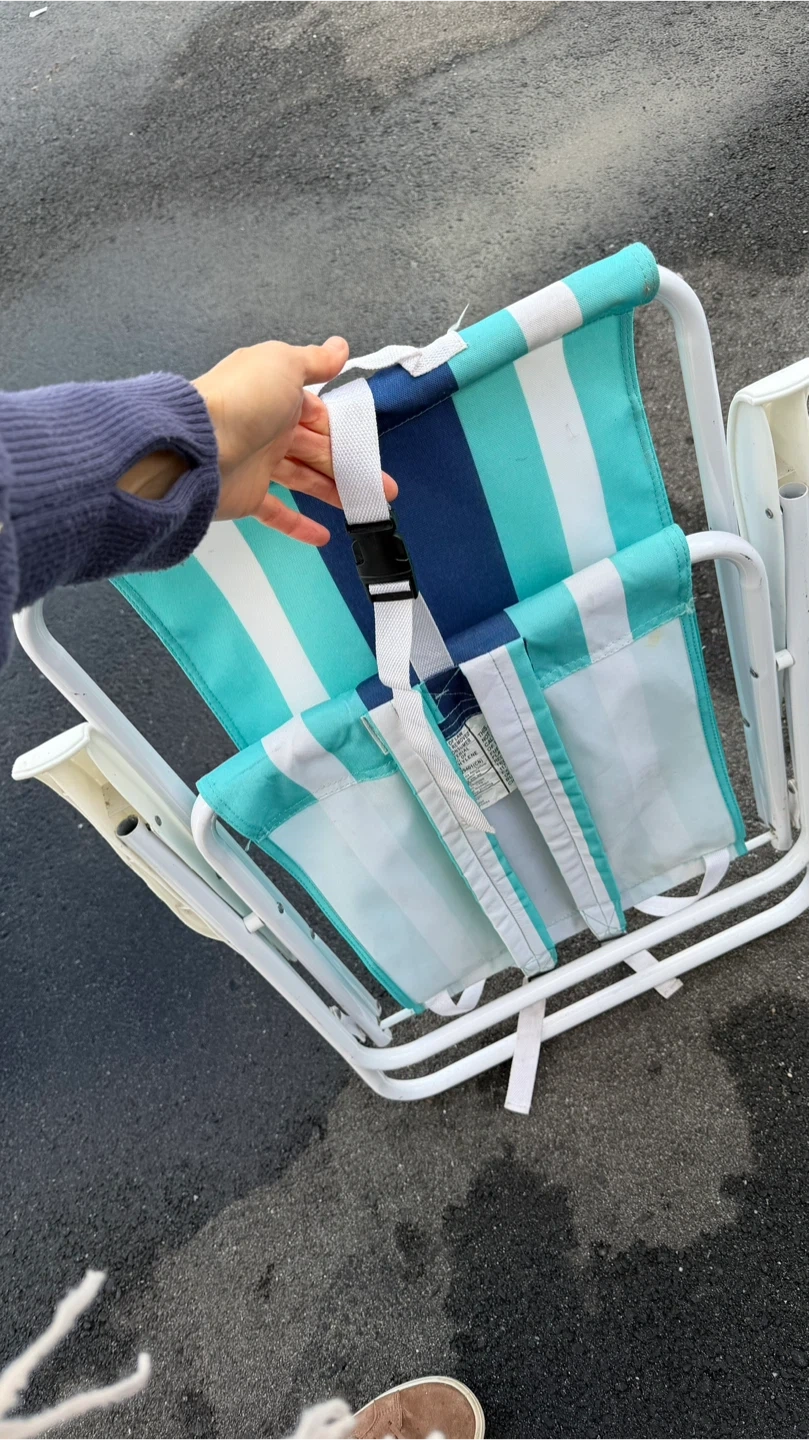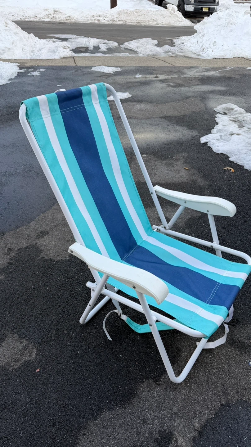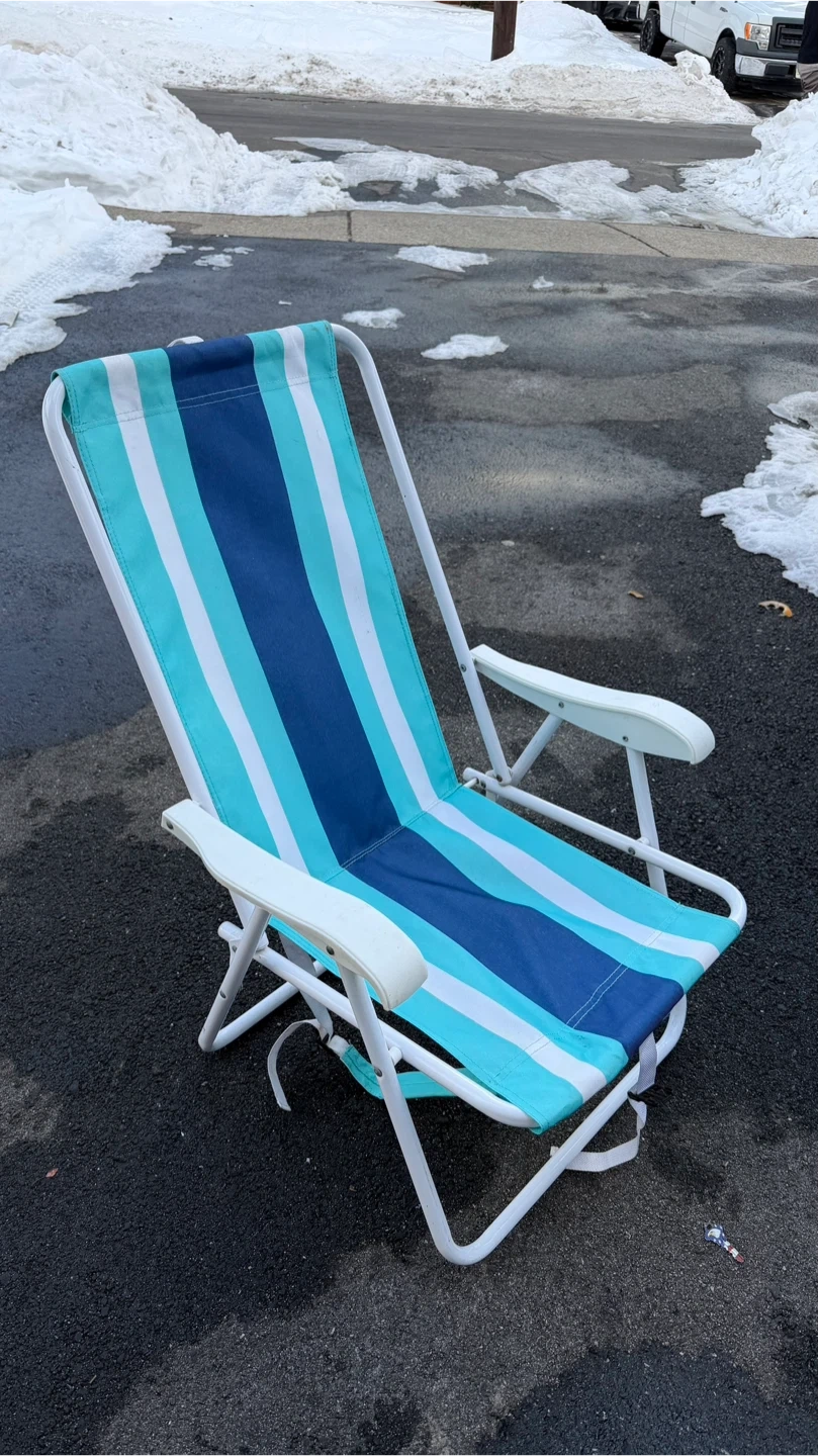 This is a striped beach chair with a white metal frame. It's foldable for easy transport and storage. The fabric has a striped pattern in blue, white, and turquoise.