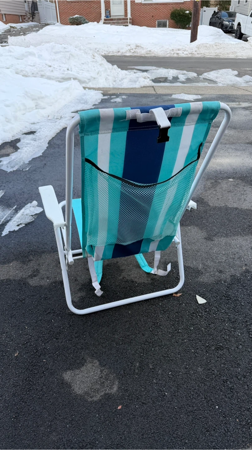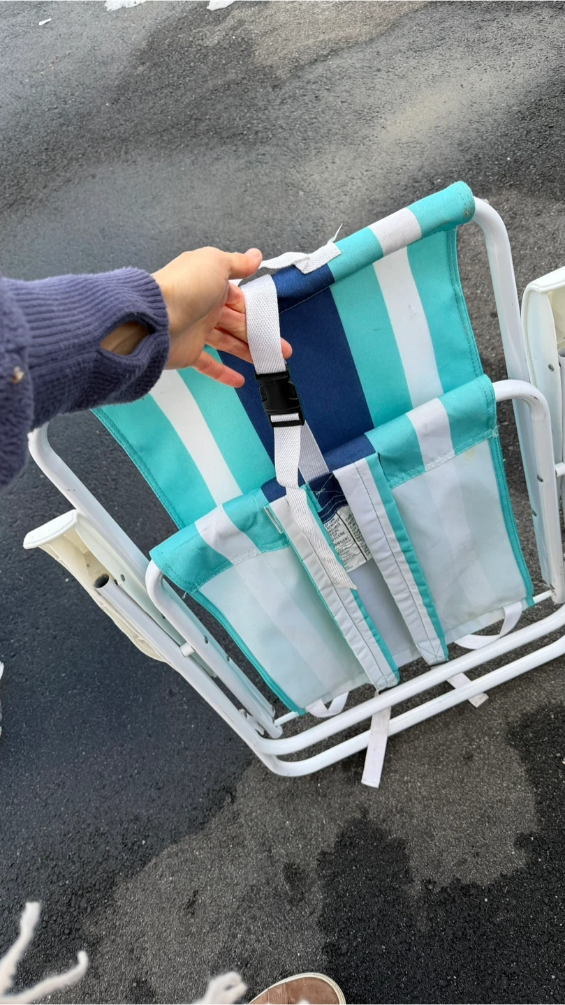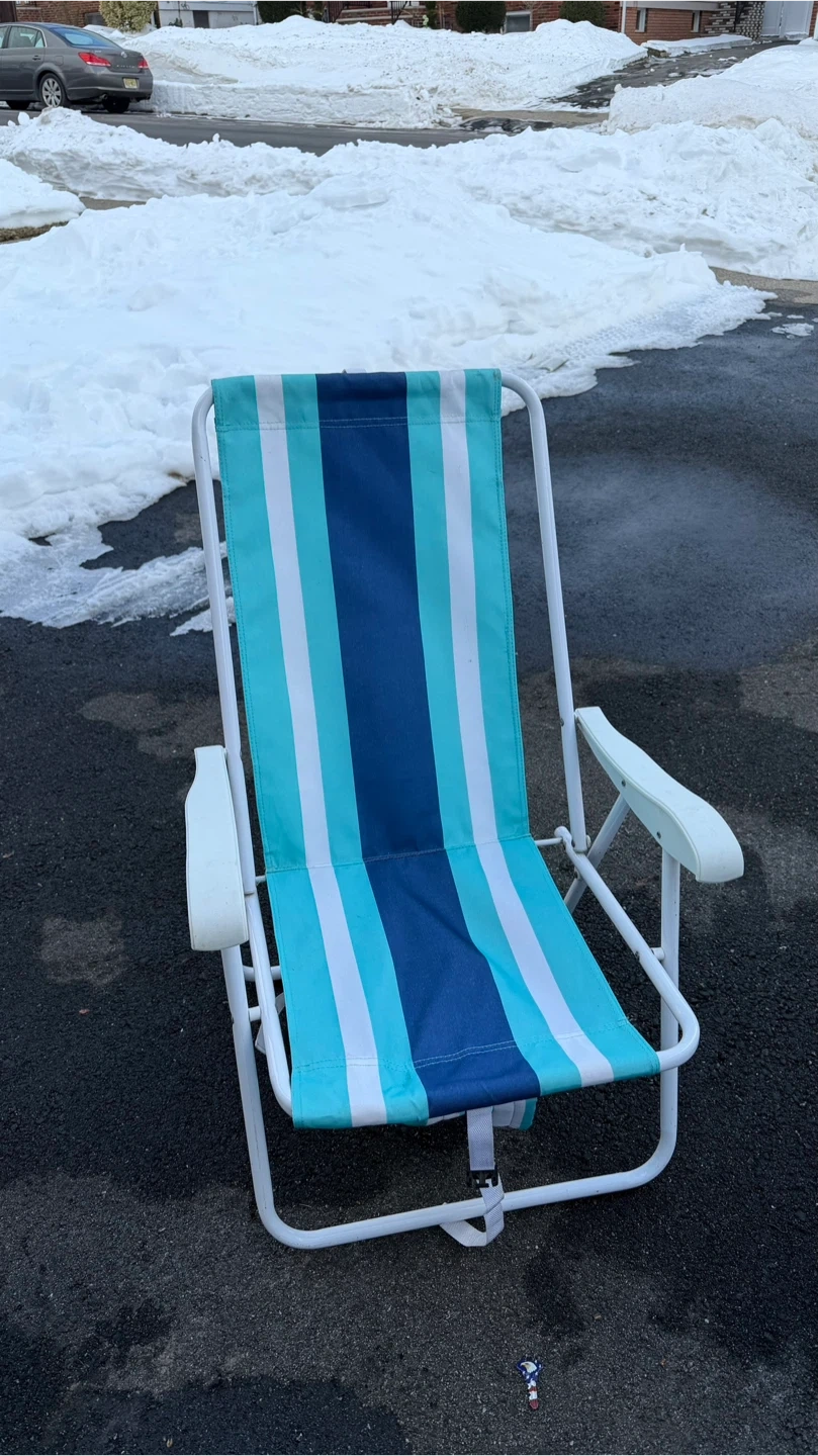 This is a striped beach chair with a white metal frame. It's foldable for easy transport and storage. The fabric has a striped pattern in blue, white, and turquoise.