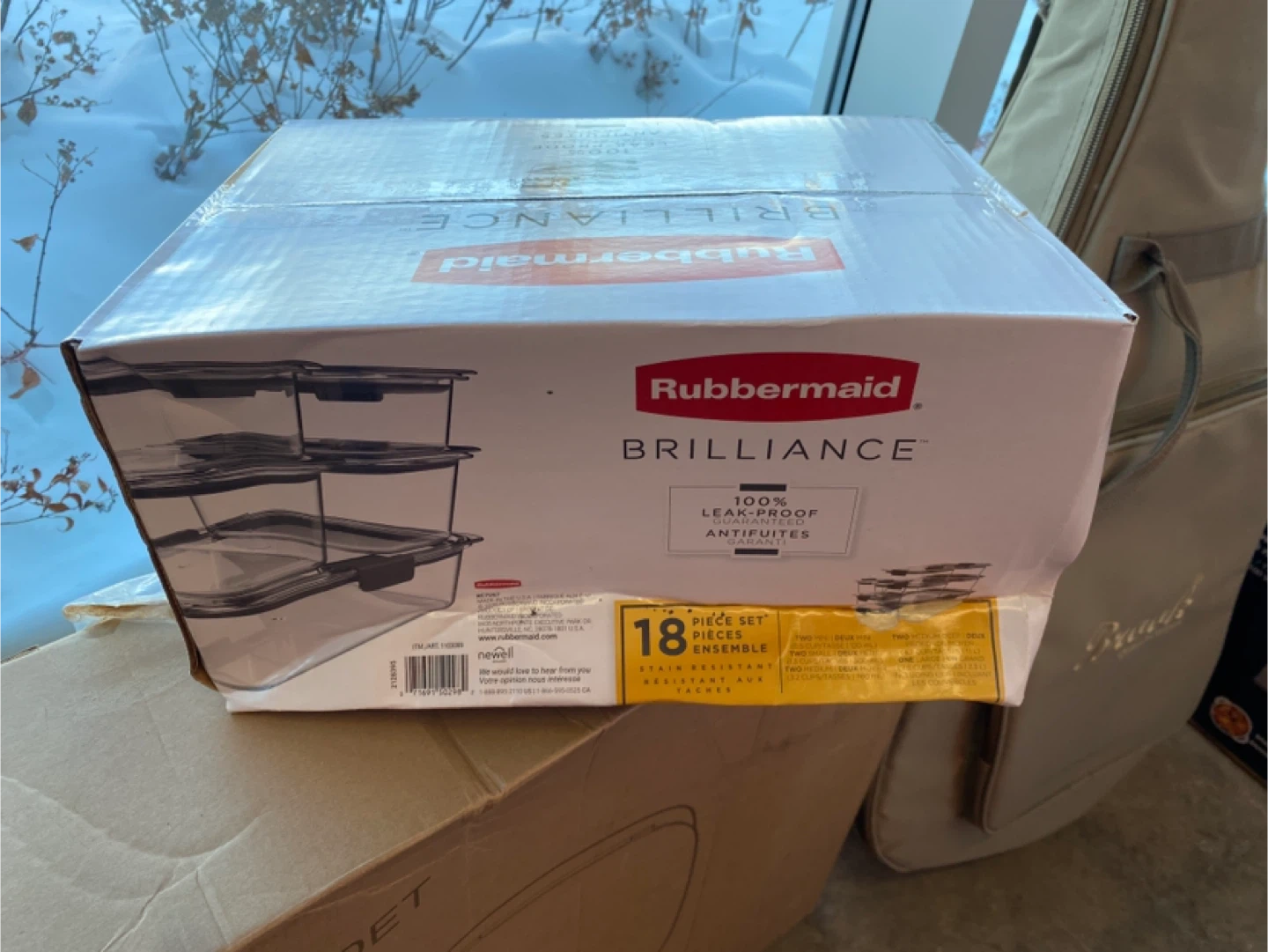 This is a Rubbermaid Brilliance 18-piece food storage set. It's 100% leak-proof guaranteed and stain-resistant. The set includes two 1.3 cup containers, two 3.2 cup containers, and one 9.6 cup container.