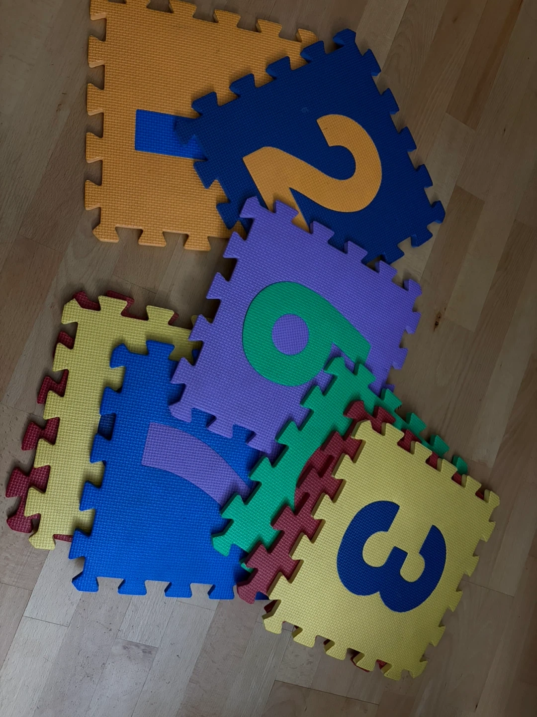 These foam tiles feature brightly coloured numbers for interactive play. They're made of soft, durable foam, interlocking for easy assembly. Numbers 1-9