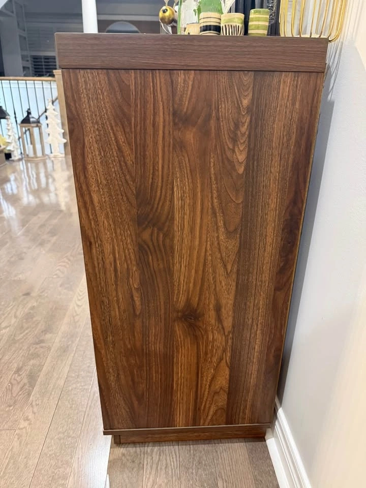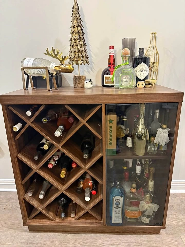 Holds several bottles of wine in designated spots as well as a moveable shelf for hard liquor. Wood with glass door on one side that pushes in to close, and also has rack to hold some wine glasses inside. Can also be used as a sideboard. Dimensions: 34” x 34”. In great condition. Must pick up in Stouffville.