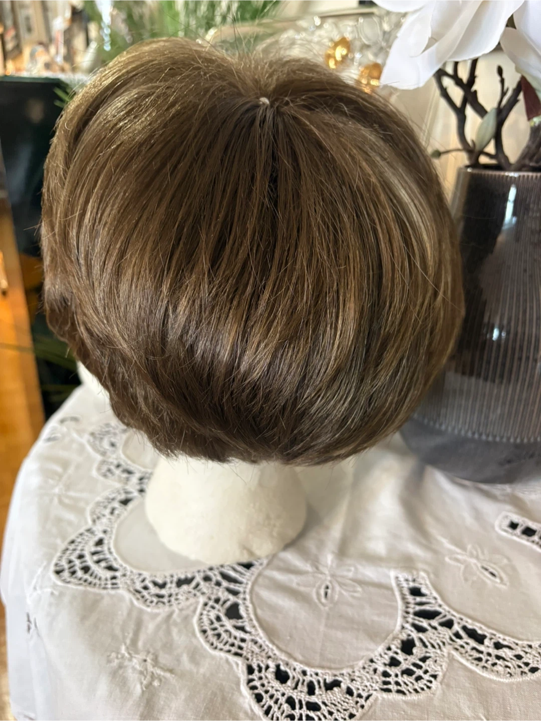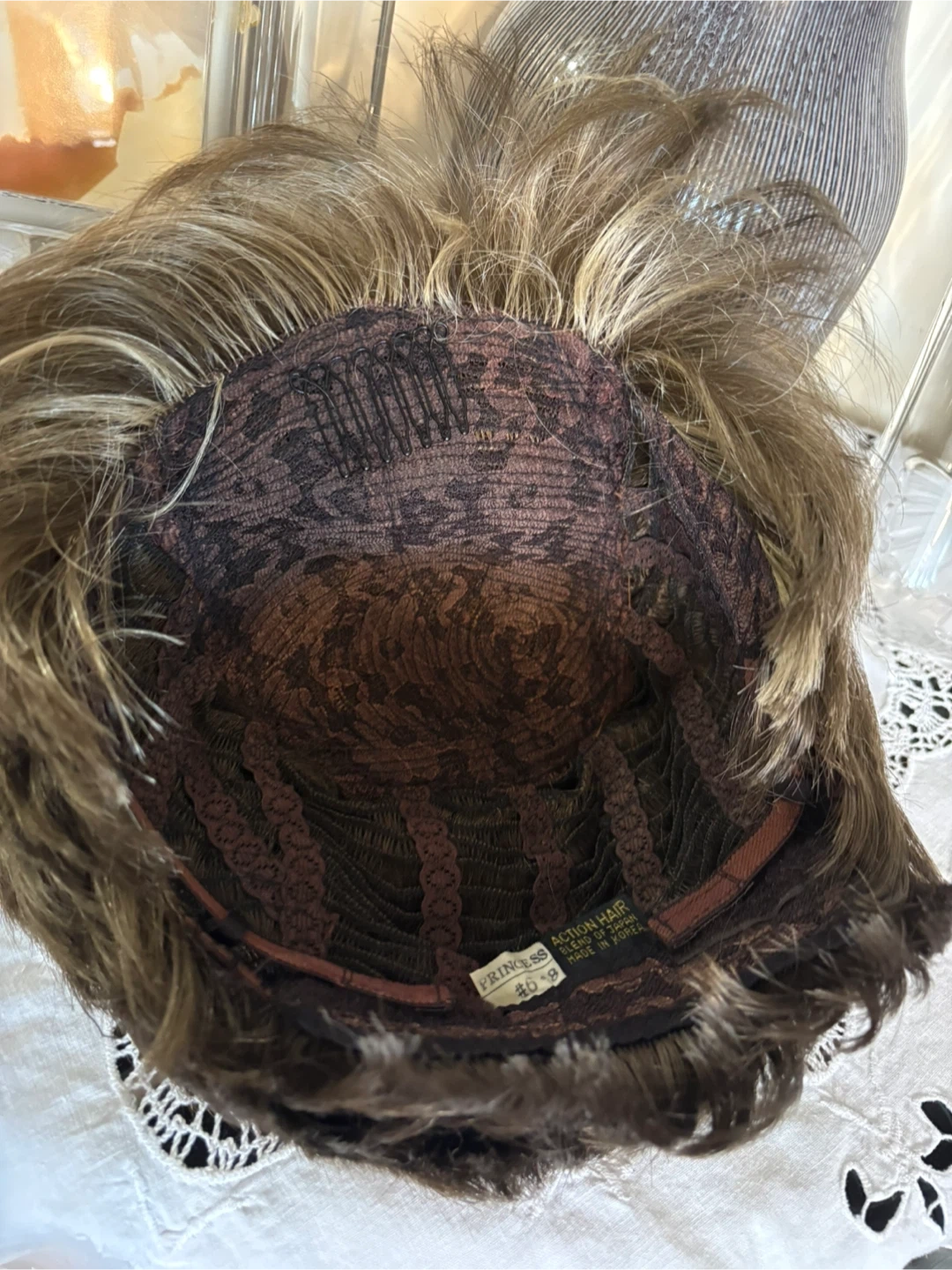 This is a Princess Action short, layered brown wig with subtle highlights. It's in good condition, perfect for a new style or a fun costume!
